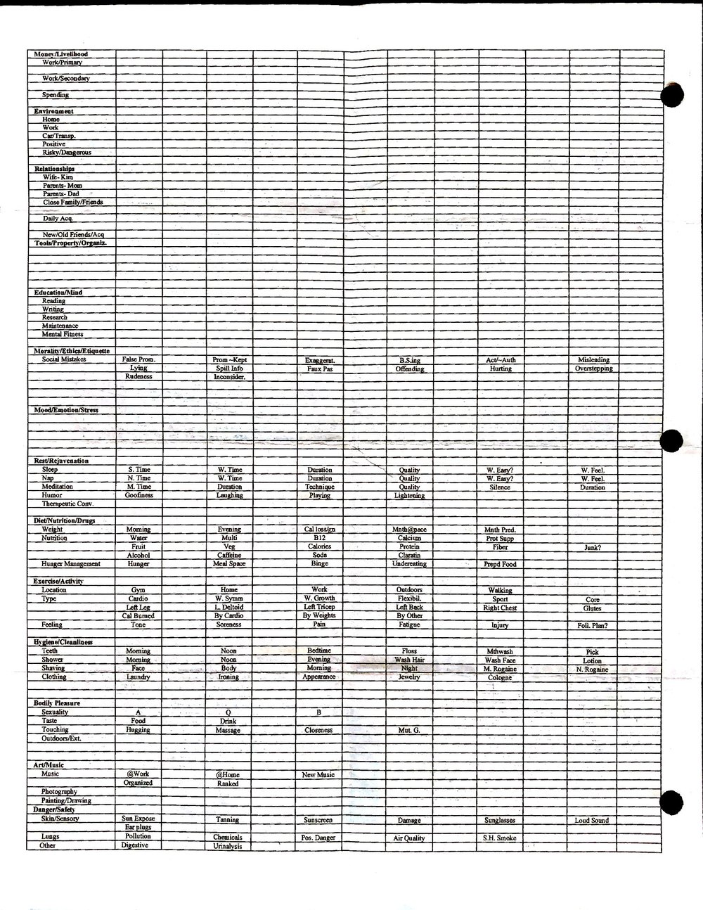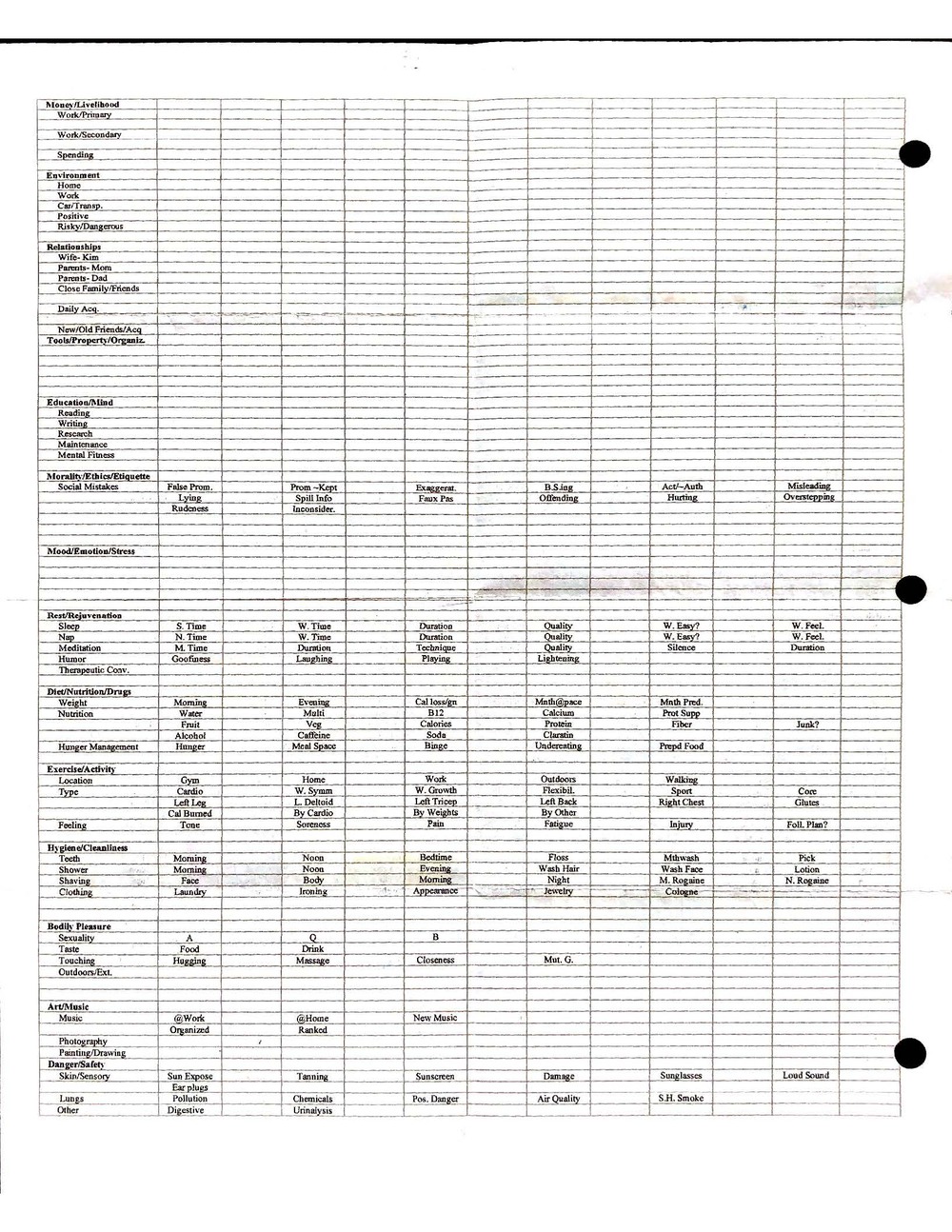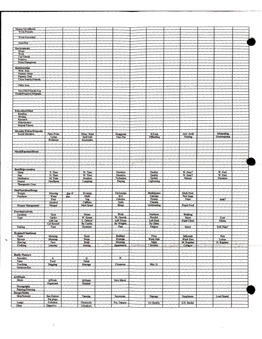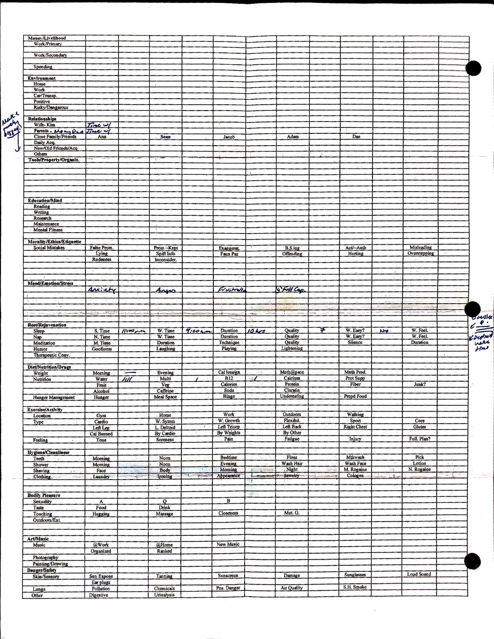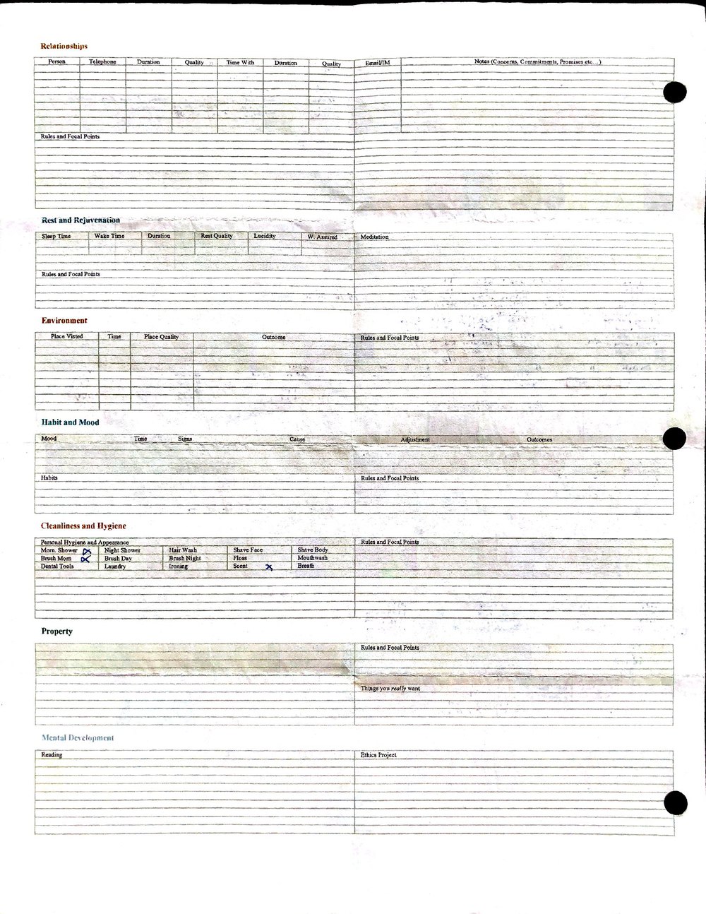 This is a highly personal and private document, shared for transparency, to give additional background on my work in moral philosophy. Its purpose is to enable personal self-help, but the overarching goal is moral in nature. I kept personal forms to track important activities in my life for a long period of time, and used the process to understand what it takes to make large amounts of personal changes independently. It is large, at ~410 MBs, and over 500 pages, so might take a bit to download and view. Not every form I filled was kept and included in this archive, and I suspect perhaps a hundred or so went missing. I kept very good records, but I do find pages on occasion that did not make it into the binder.