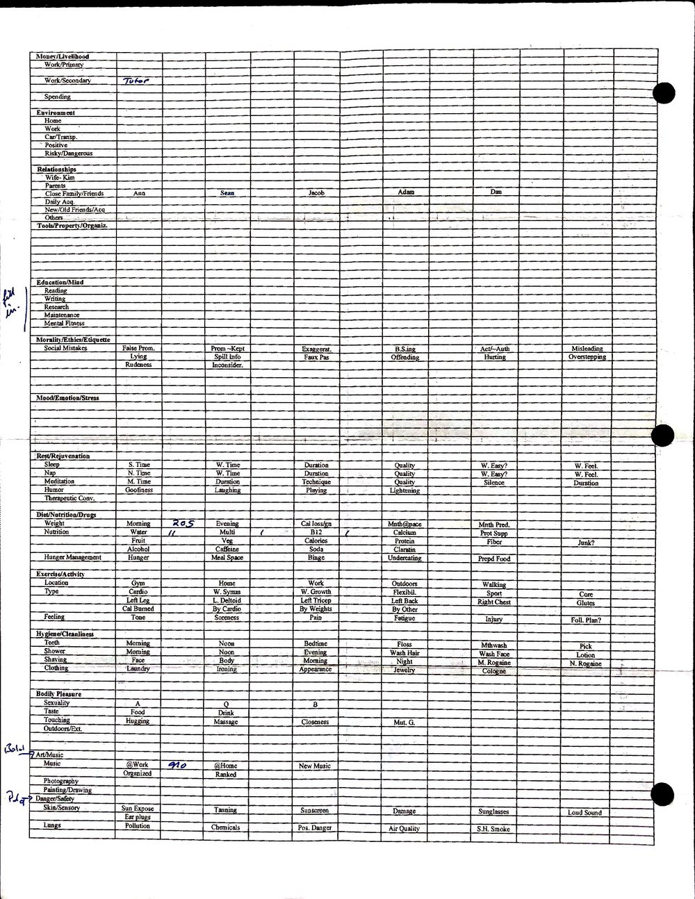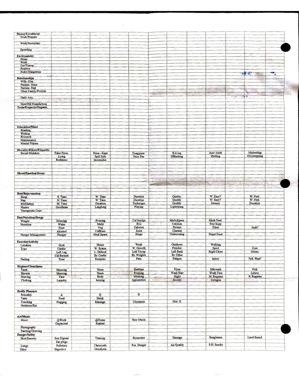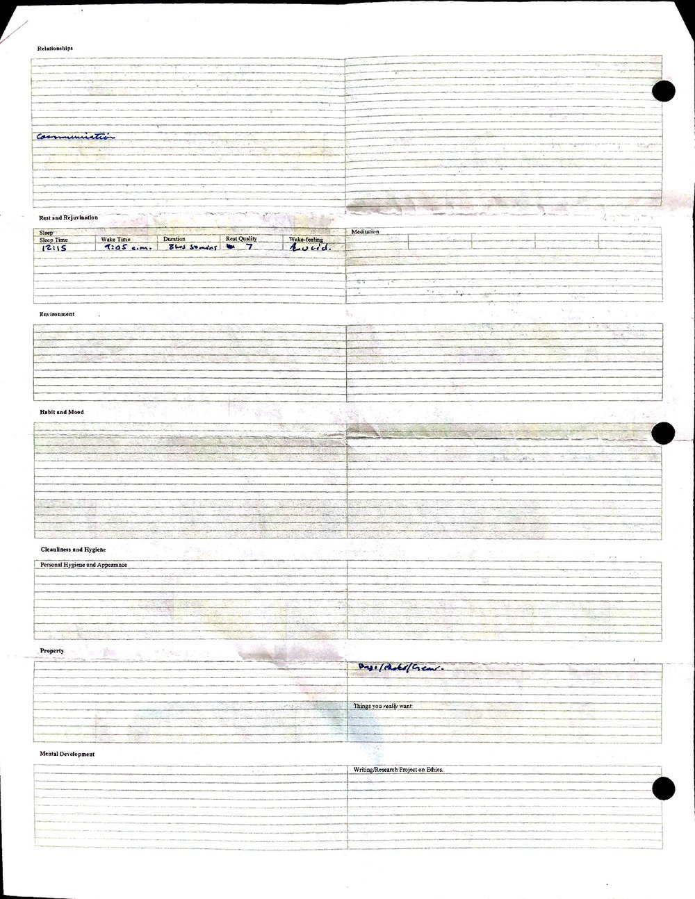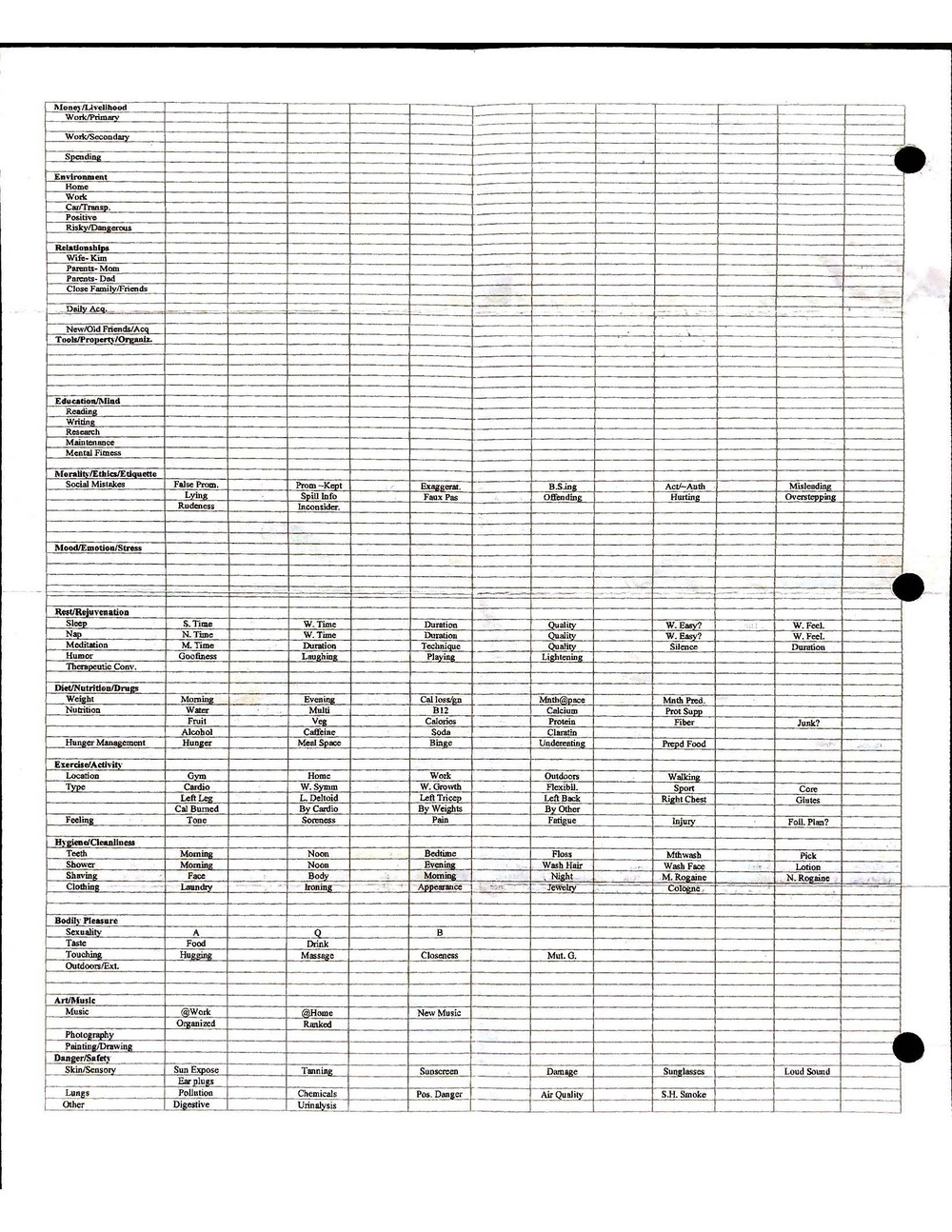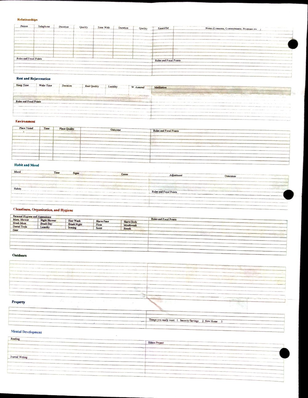 This is a highly personal and private document, shared for transparency, to give additional background on my work in moral philosophy. Its purpose is to enable personal self-help, but the overarching goal is moral in nature. I kept personal forms to track important activities in my life for a long period of time, and used the process to understand what it takes to make large amounts of personal changes independently. It is large, at ~410 MBs, and over 500 pages, so might take a bit to download and view. Not every form I filled was kept and included in this archive, and I suspect perhaps a hundred or so went missing. I kept very good records, but I do find pages on occasion that did not make it into the binder.
