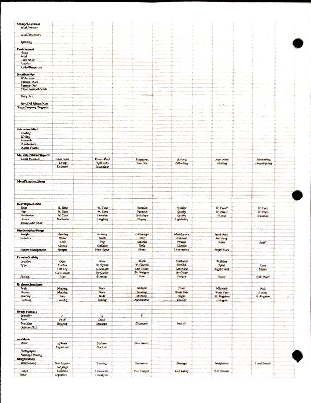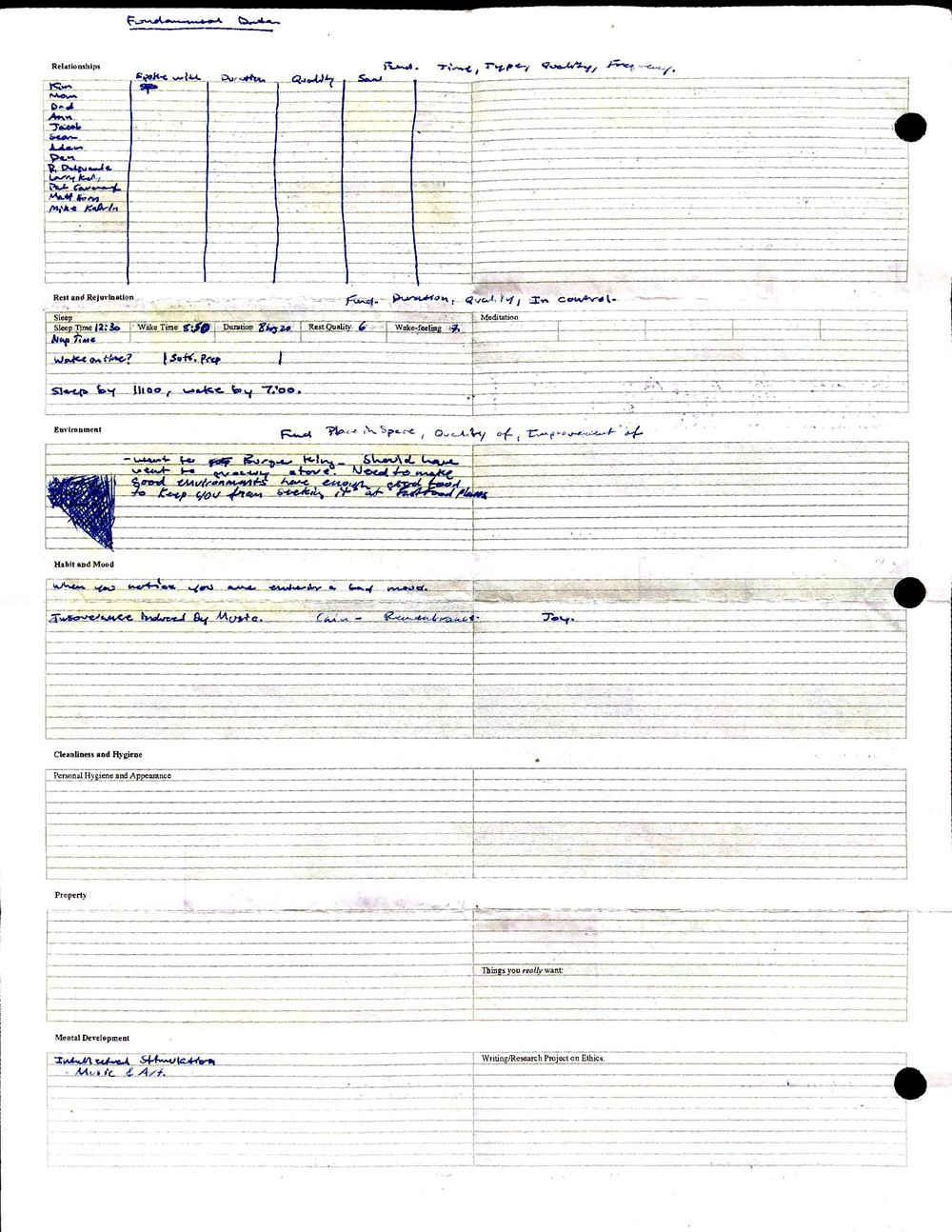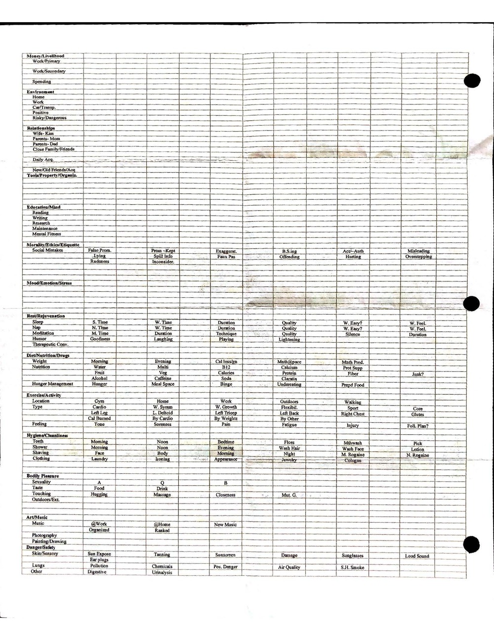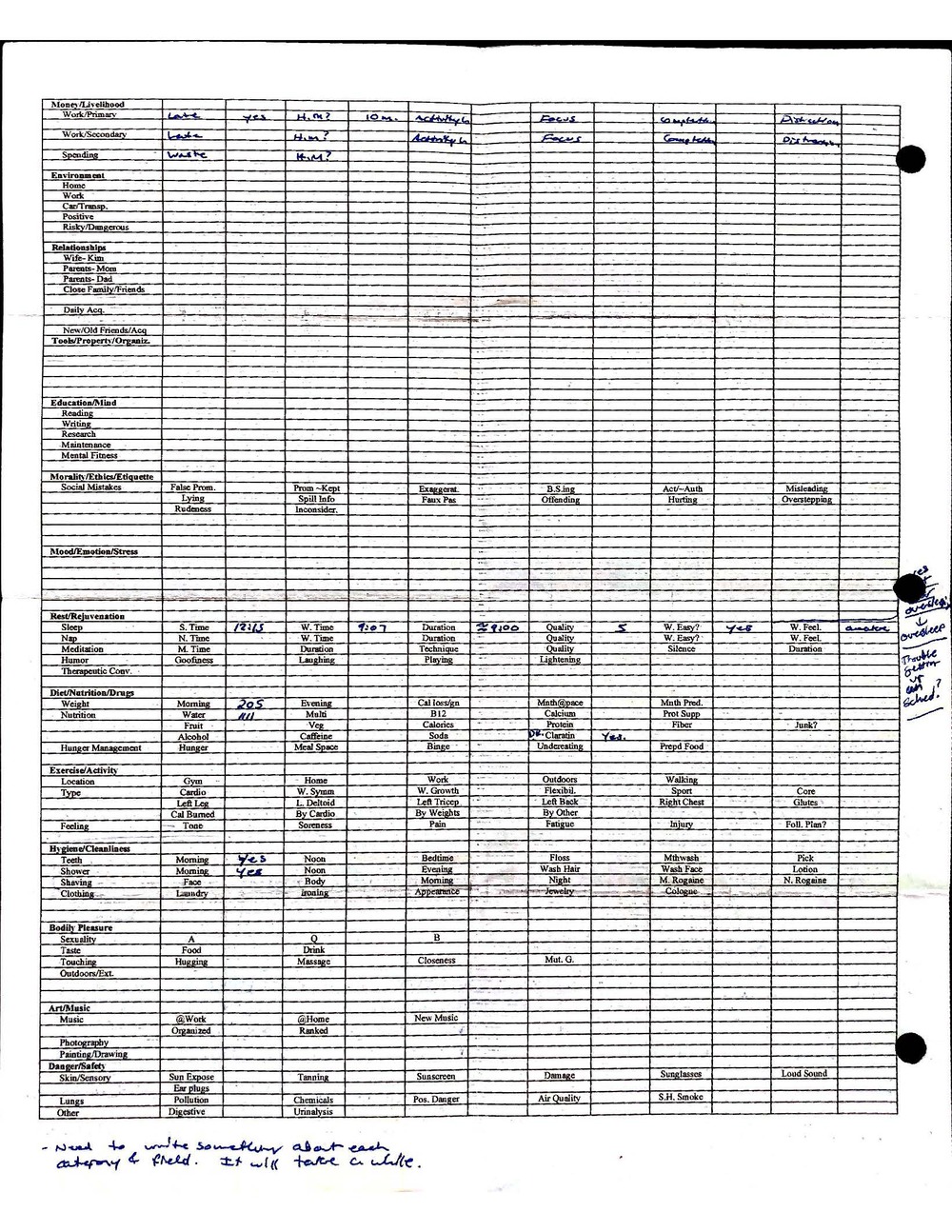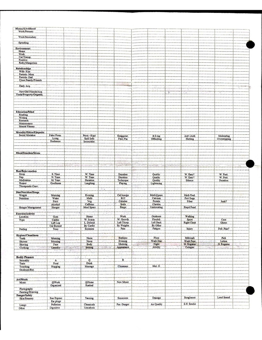 This is a highly personal and private document, shared for transparency, to give additional background on my work in moral philosophy. Its purpose is to enable personal self-help, but the overarching goal is moral in nature. I kept personal forms to track important activities in my life for a long period of time, and used the process to understand what it takes to make large amounts of personal changes independently. It is large, at ~410 MBs, and over 500 pages, so might take a bit to download and view. Not every form I filled was kept and included in this archive, and I suspect perhaps a hundred or so went missing. I kept very good records, but I do find pages on occasion that did not make it into the binder.