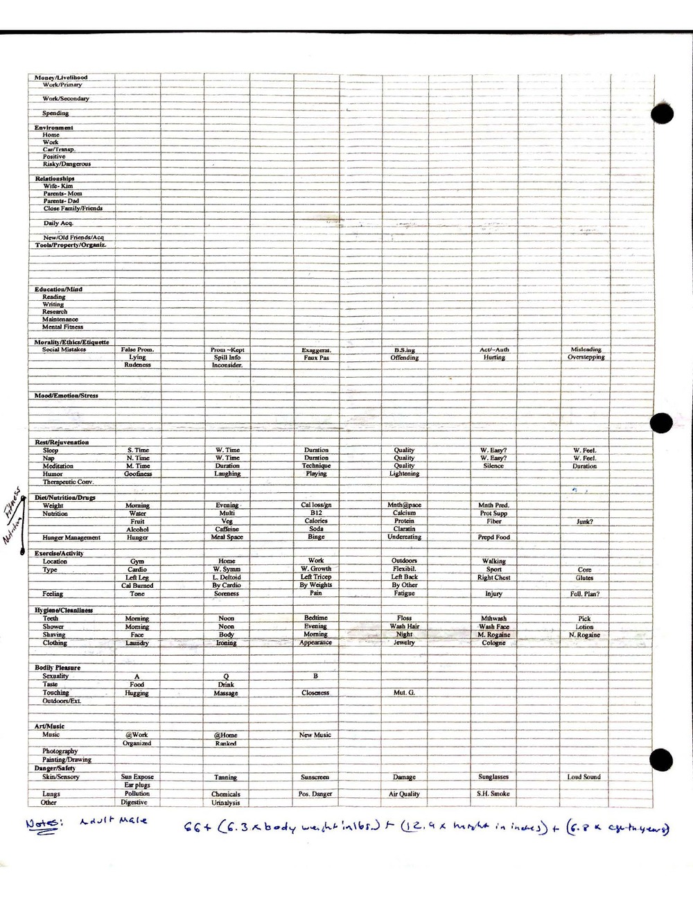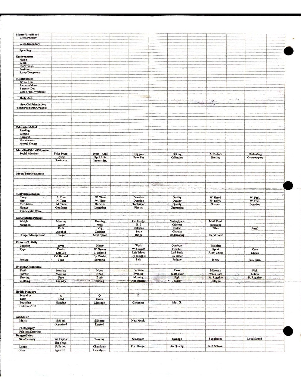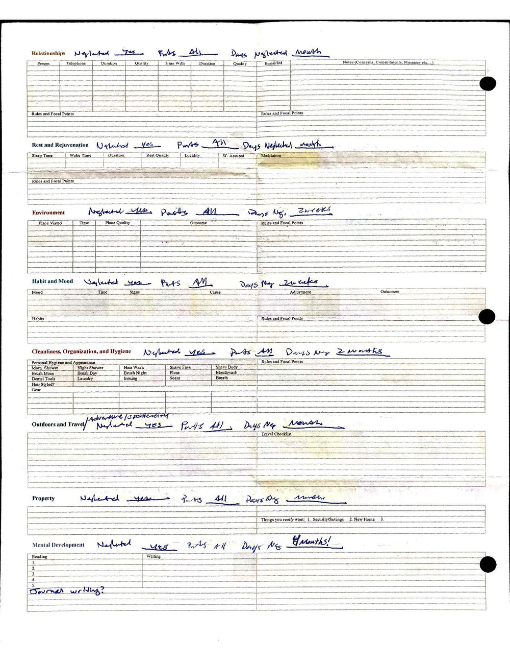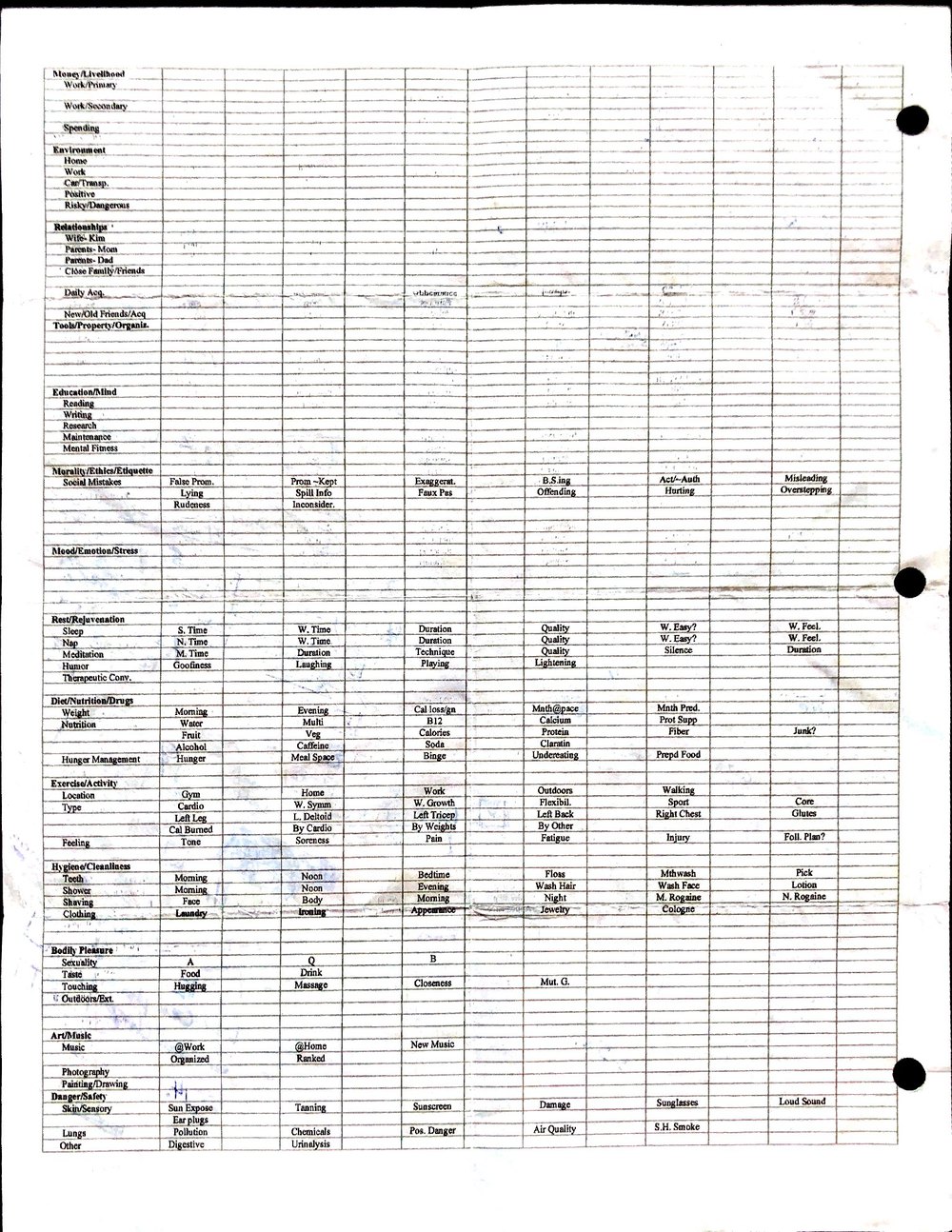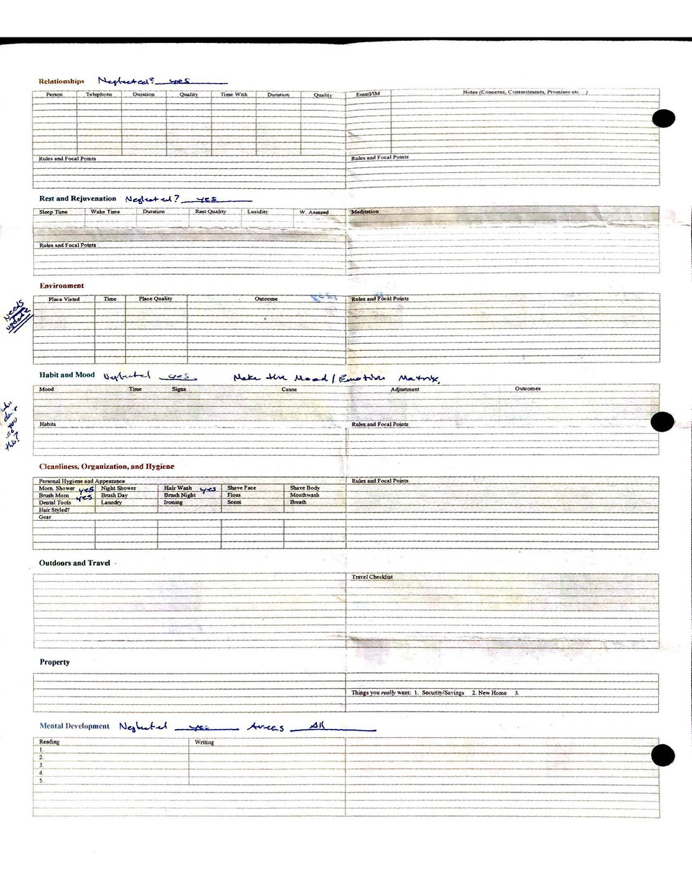 This is a highly personal and private document, shared for transparency, to give additional background on my work in moral philosophy. Its purpose is to enable personal self-help, but the overarching goal is moral in nature. I kept personal forms to track important activities in my life for a long period of time, and used the process to understand what it takes to make large amounts of personal changes independently. It is large, at ~410 MBs, and over 500 pages, so might take a bit to download and view. Not every form I filled was kept and included in this archive, and I suspect perhaps a hundred or so went missing. I kept very good records, but I do find pages on occasion that did not make it into the binder.