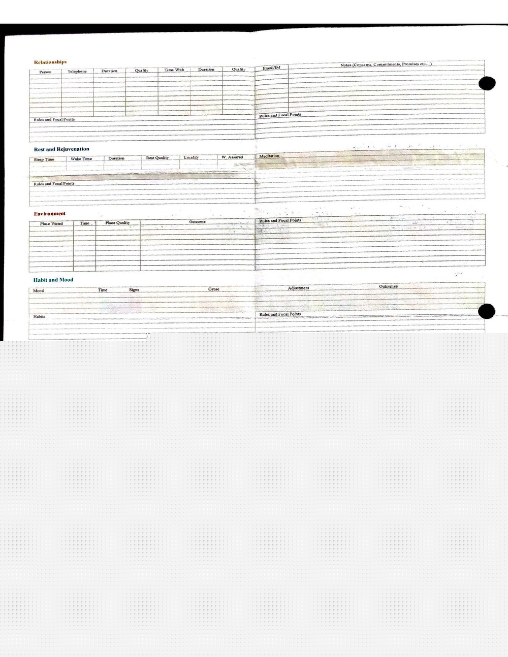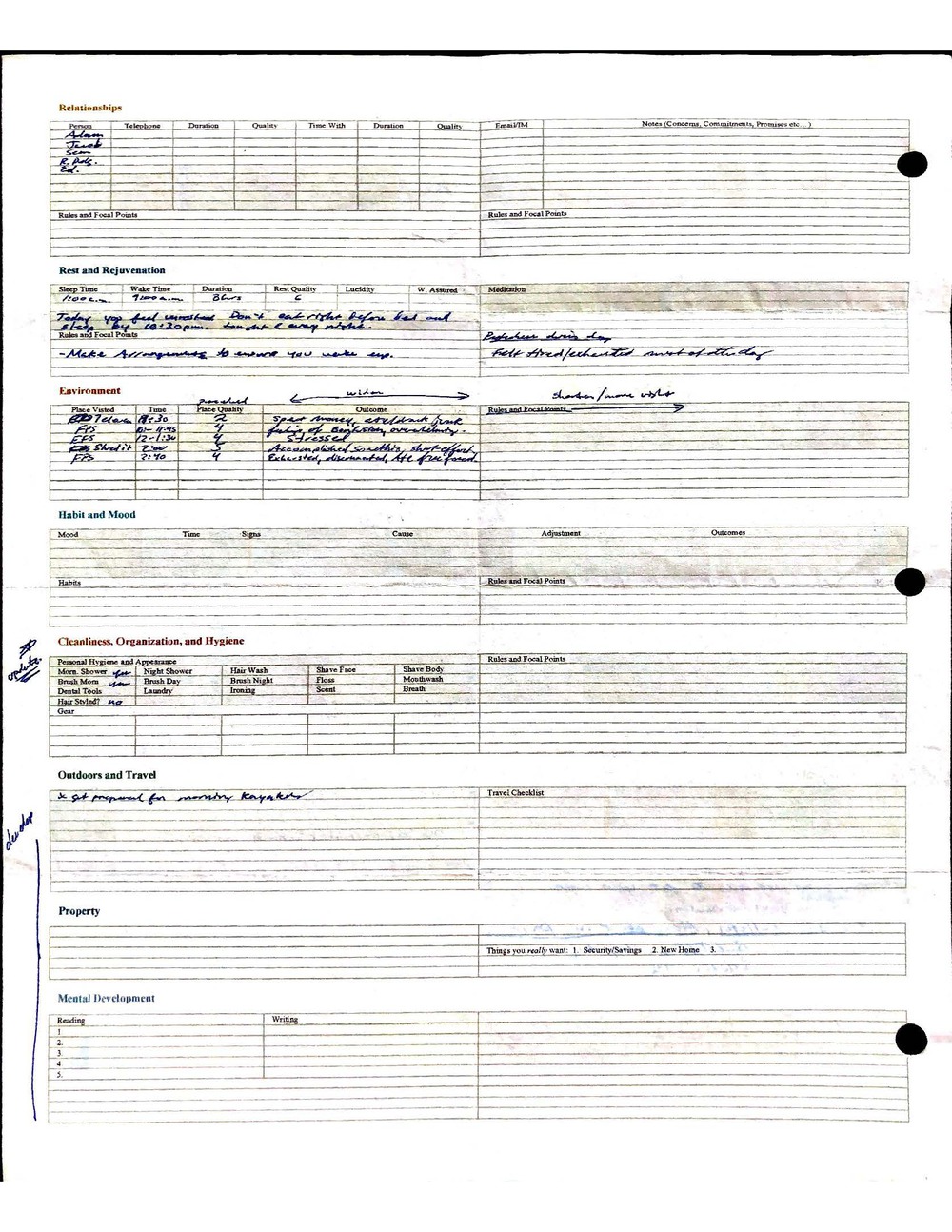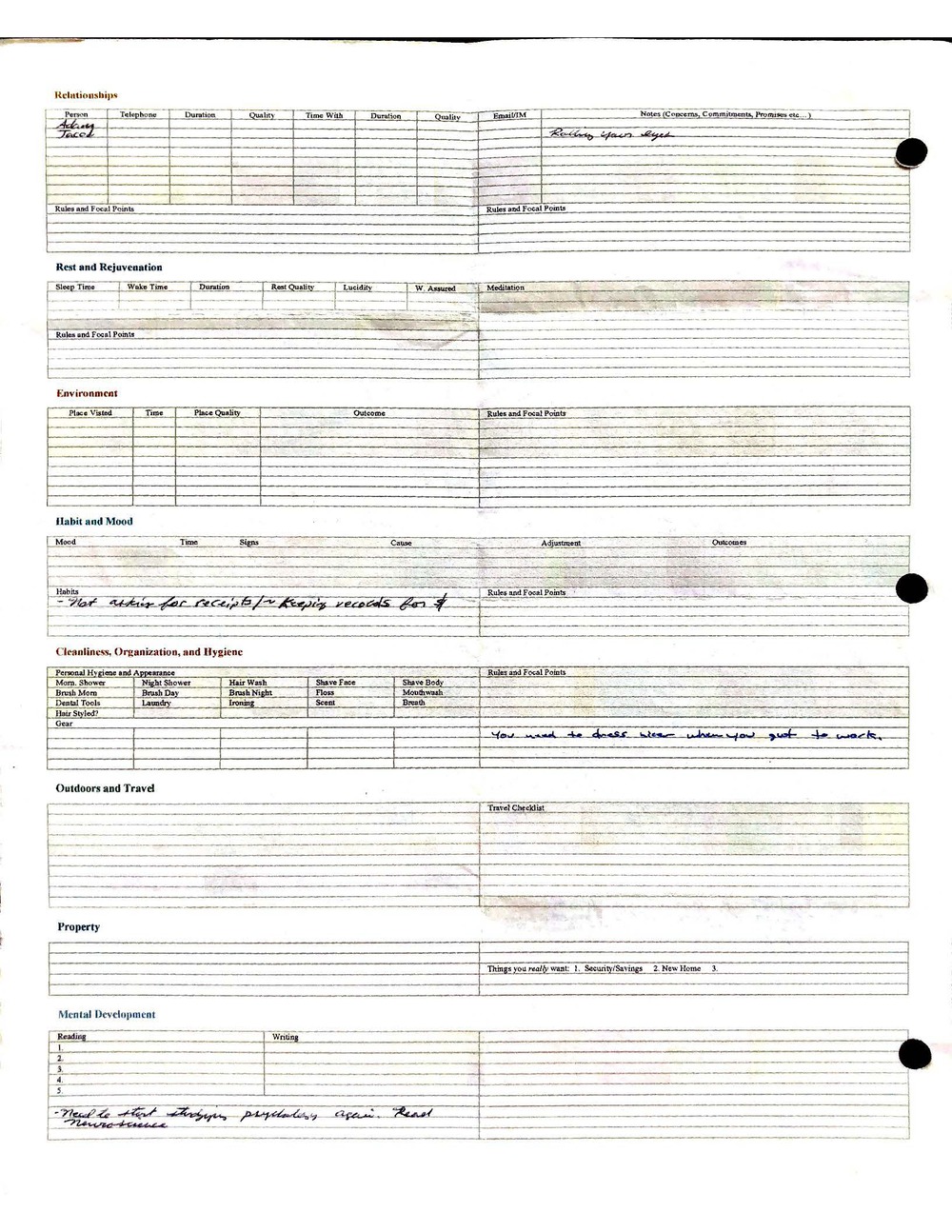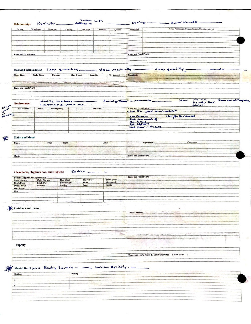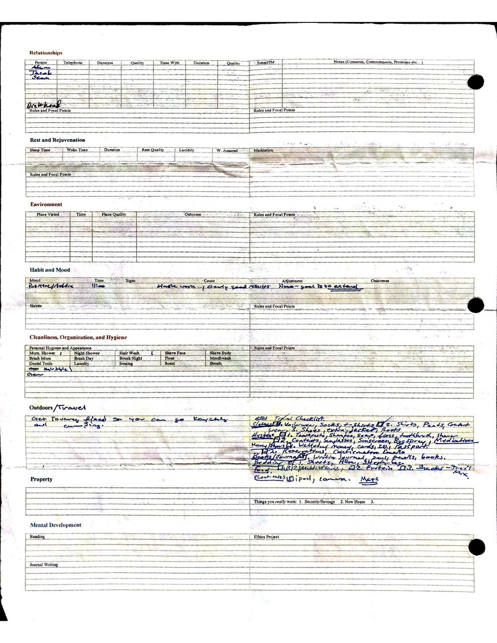 This is a highly personal and private document, shared for transparency, to give additional background on my work in moral philosophy. Its purpose is to enable personal self-help, but the overarching goal is moral in nature. I kept personal forms to track important activities in my life for a long period of time, and used the process to understand what it takes to make large amounts of personal changes independently. It is large, at ~410 MBs, and over 500 pages, so might take a bit to download and view. Not every form I filled was kept and included in this archive, and I suspect perhaps a hundred or so went missing. I kept very good records, but I do find pages on occasion that did not make it into the binder.