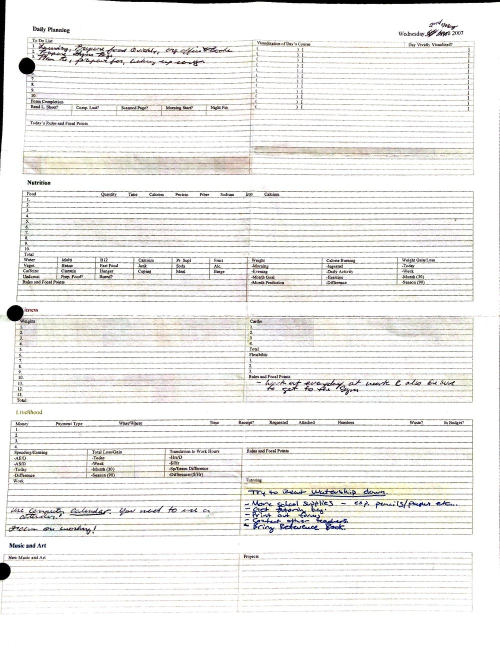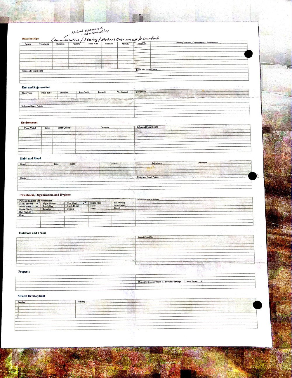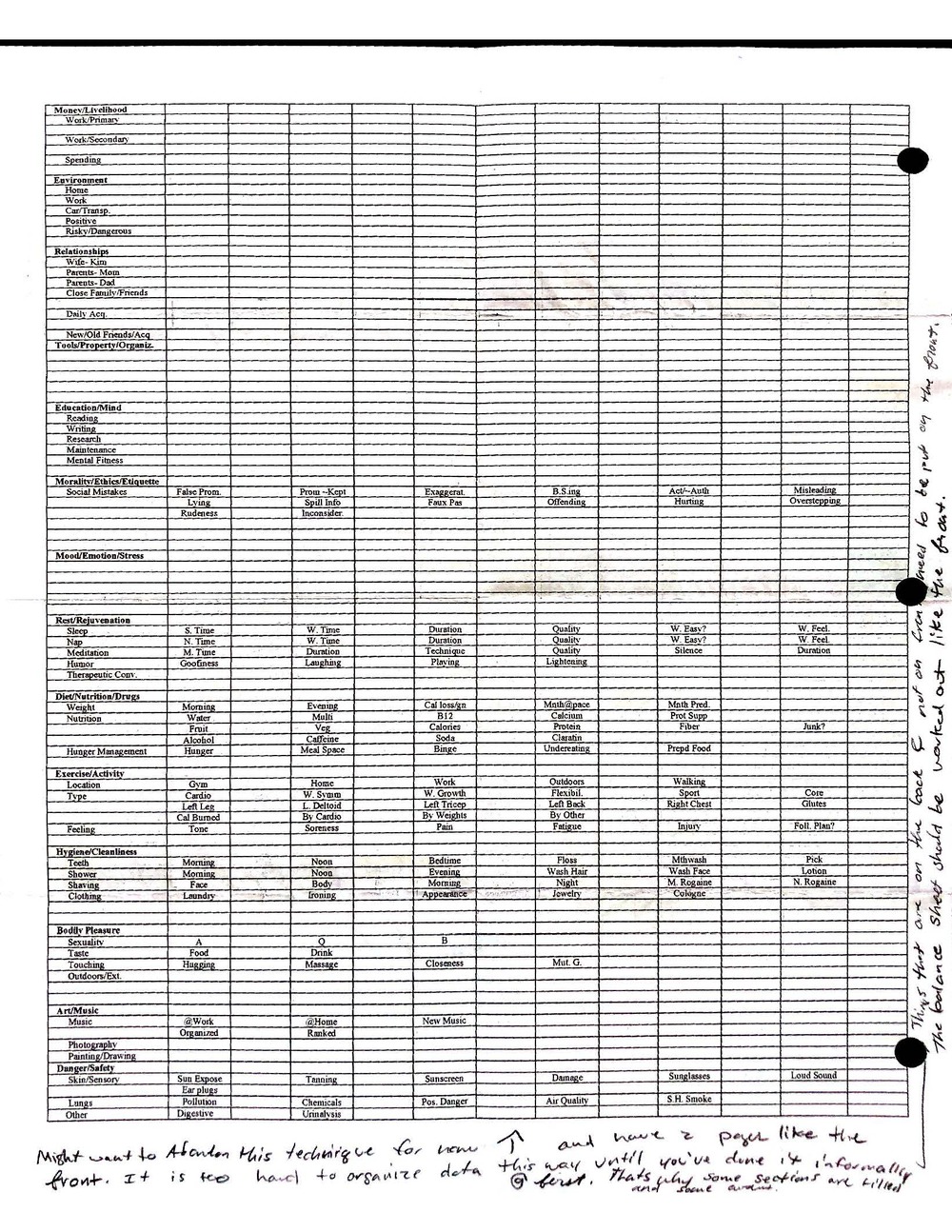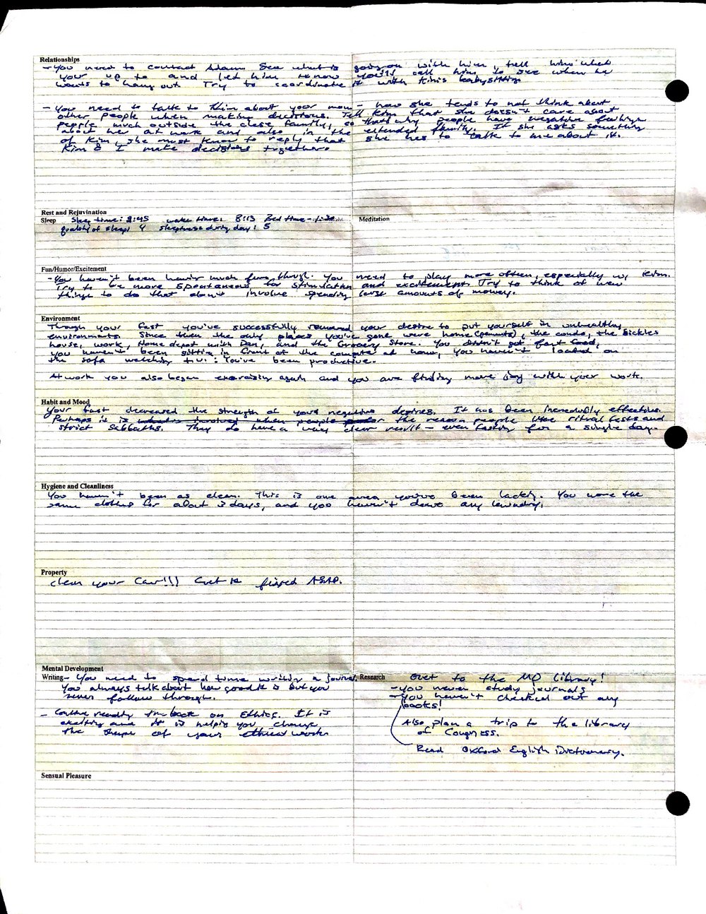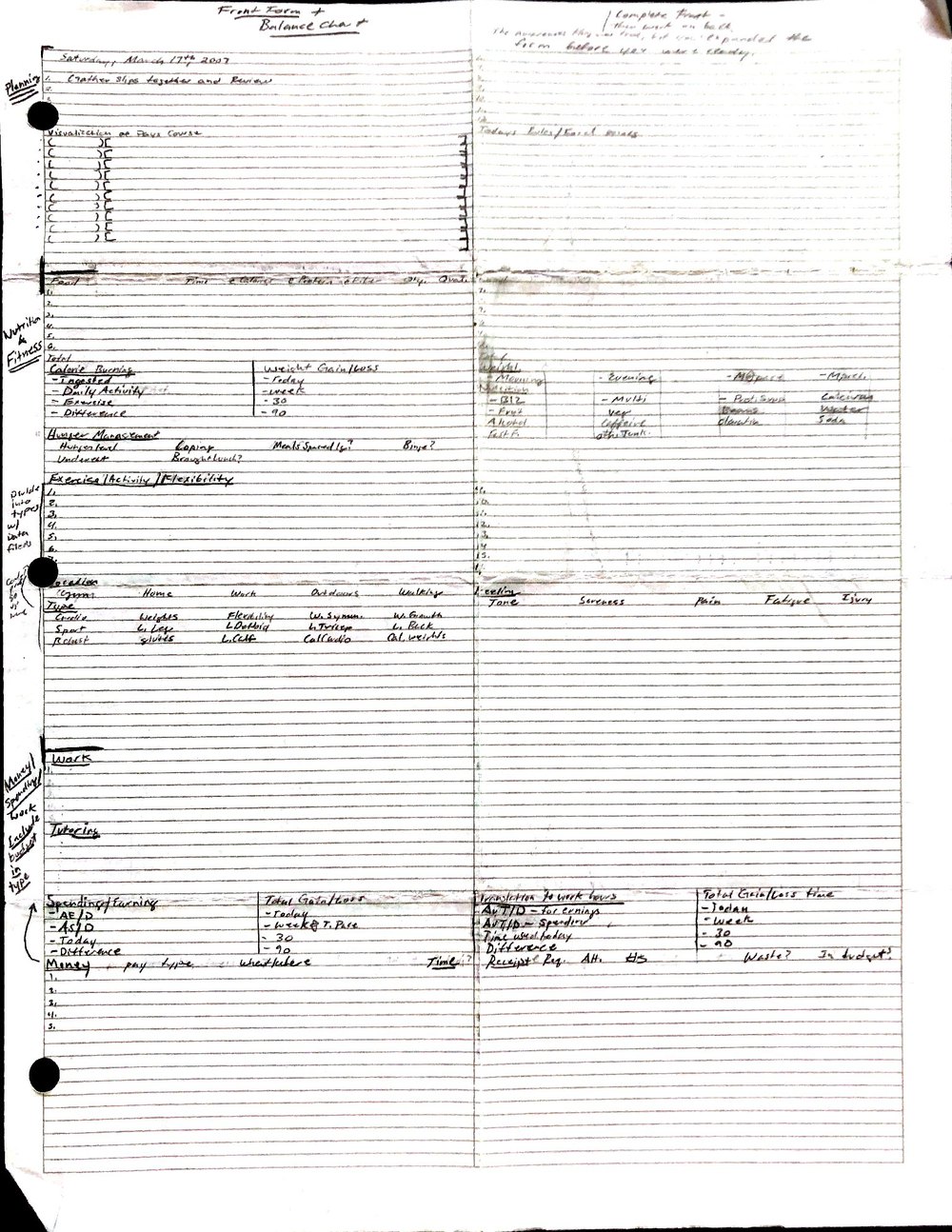 This is a highly personal and private document, shared for transparency, to give additional background on my work in moral philosophy. Its purpose is to enable personal self-help, but the overarching goal is moral in nature. I kept personal forms to track important activities in my life for a long period of time, and used the process to understand what it takes to make large amounts of personal changes independently. It is large, at ~410 MBs, and over 500 pages, so might take a bit to download and view. Not every form I filled was kept and included in this archive, and I suspect perhaps a hundred or so went missing. I kept very good records, but I do find pages on occasion that did not make it into the binder.