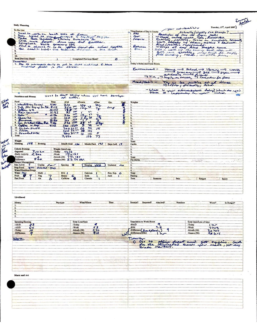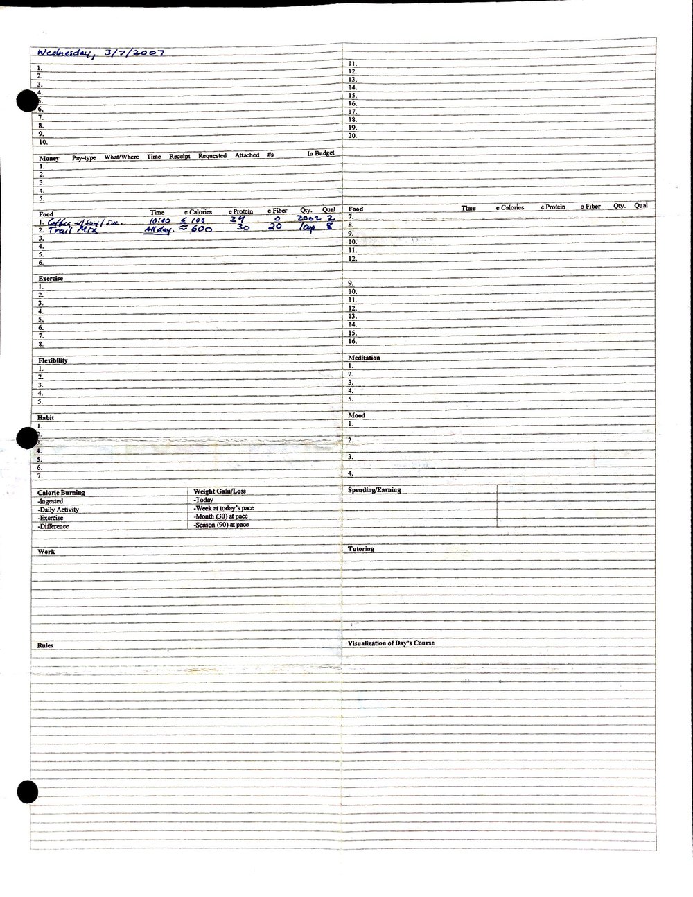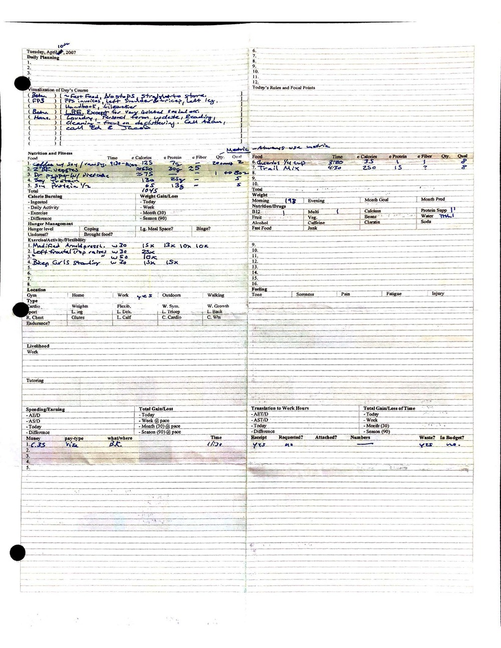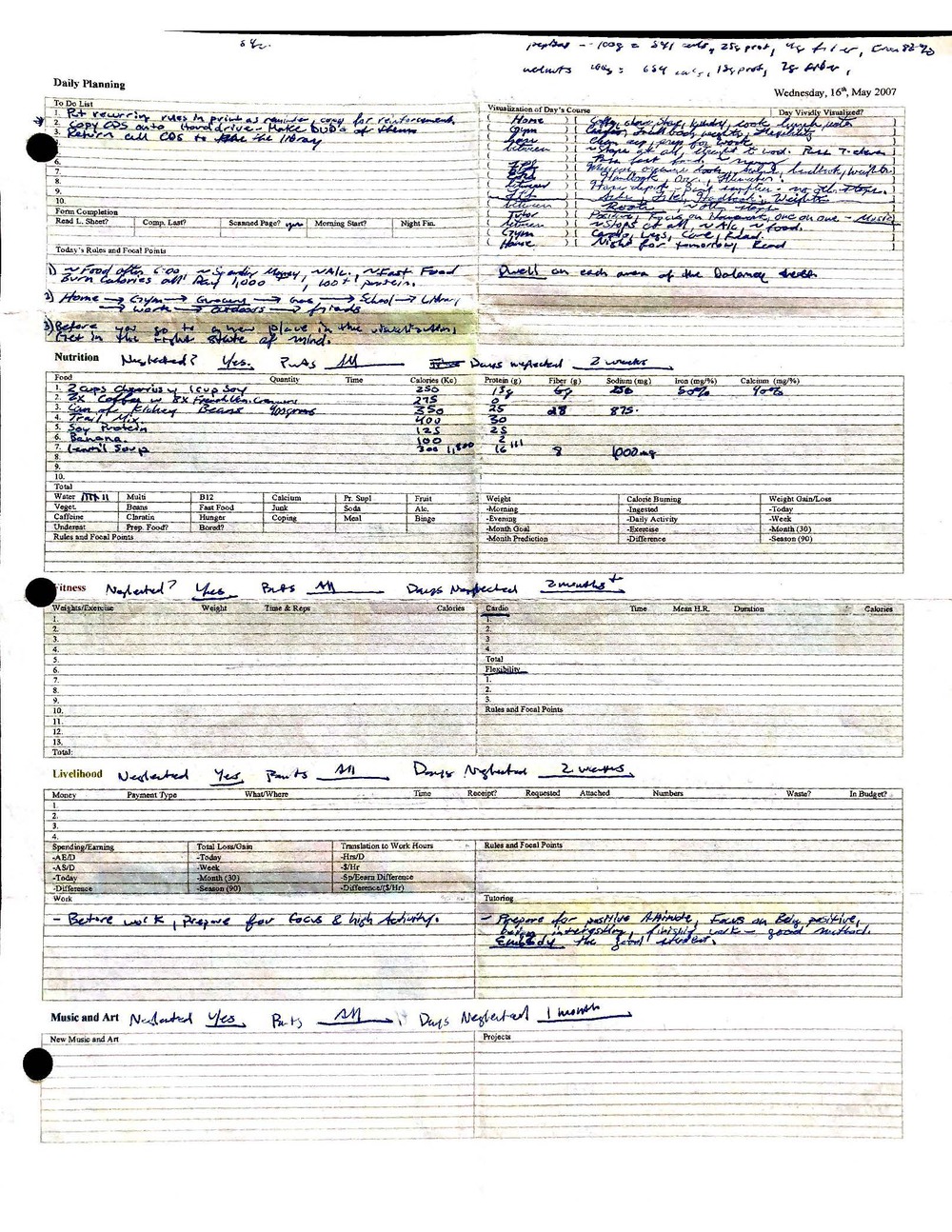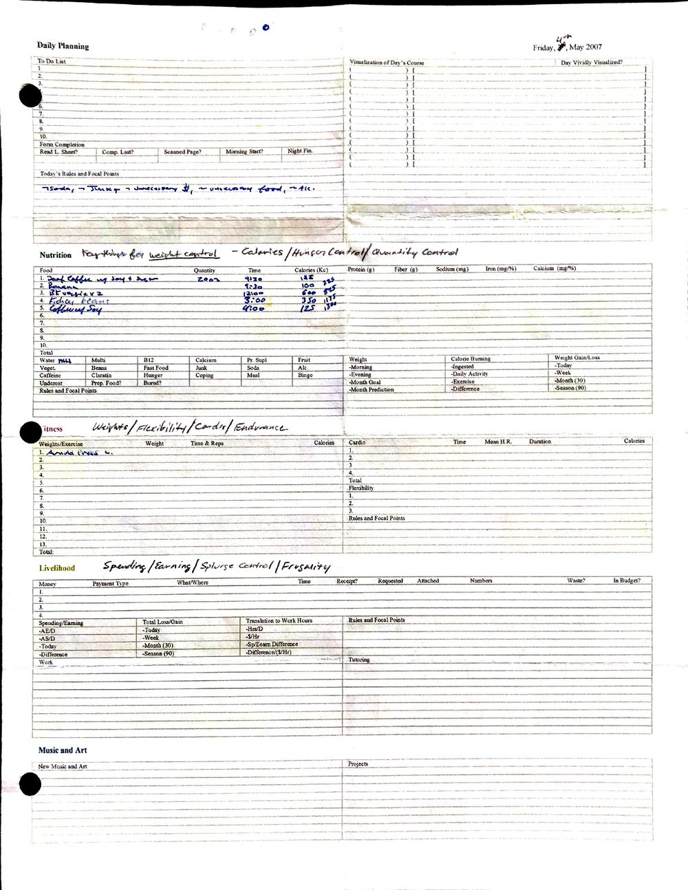 This is a highly personal and private document, shared for transparency, to give additional background on my work in moral philosophy. Its purpose is to enable personal self-help, but the overarching goal is moral in nature. I kept personal forms to track important activities in my life for a long period of time, and used the process to understand what it takes to make large amounts of personal changes independently. It is large, at ~410 MBs, and over 500 pages, so might take a bit to download and view. Not every form I filled was kept and included in this archive, and I suspect perhaps a hundred or so went missing. I kept very good records, but I do find pages on occasion that did not make it into the binder.