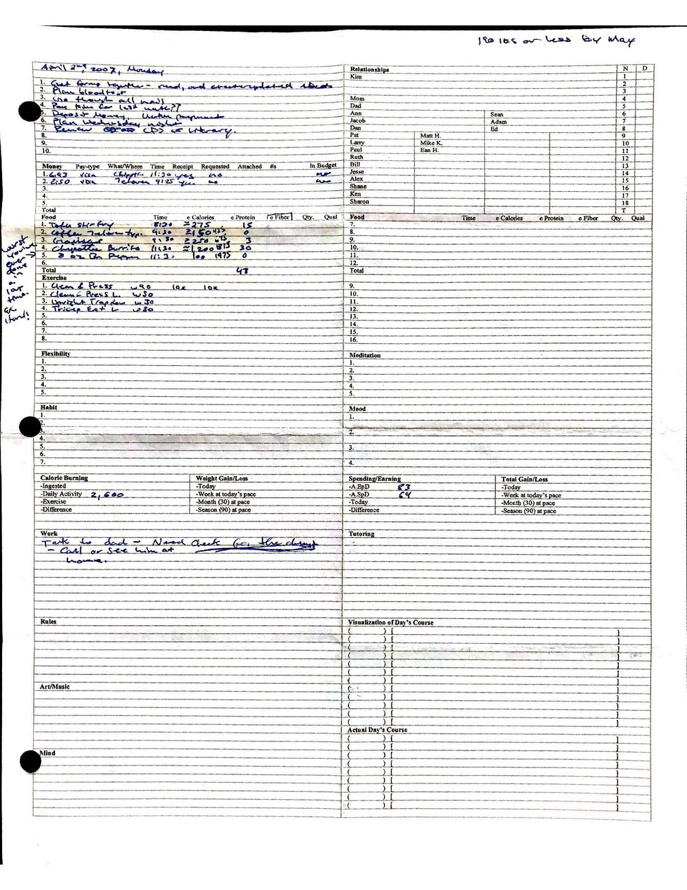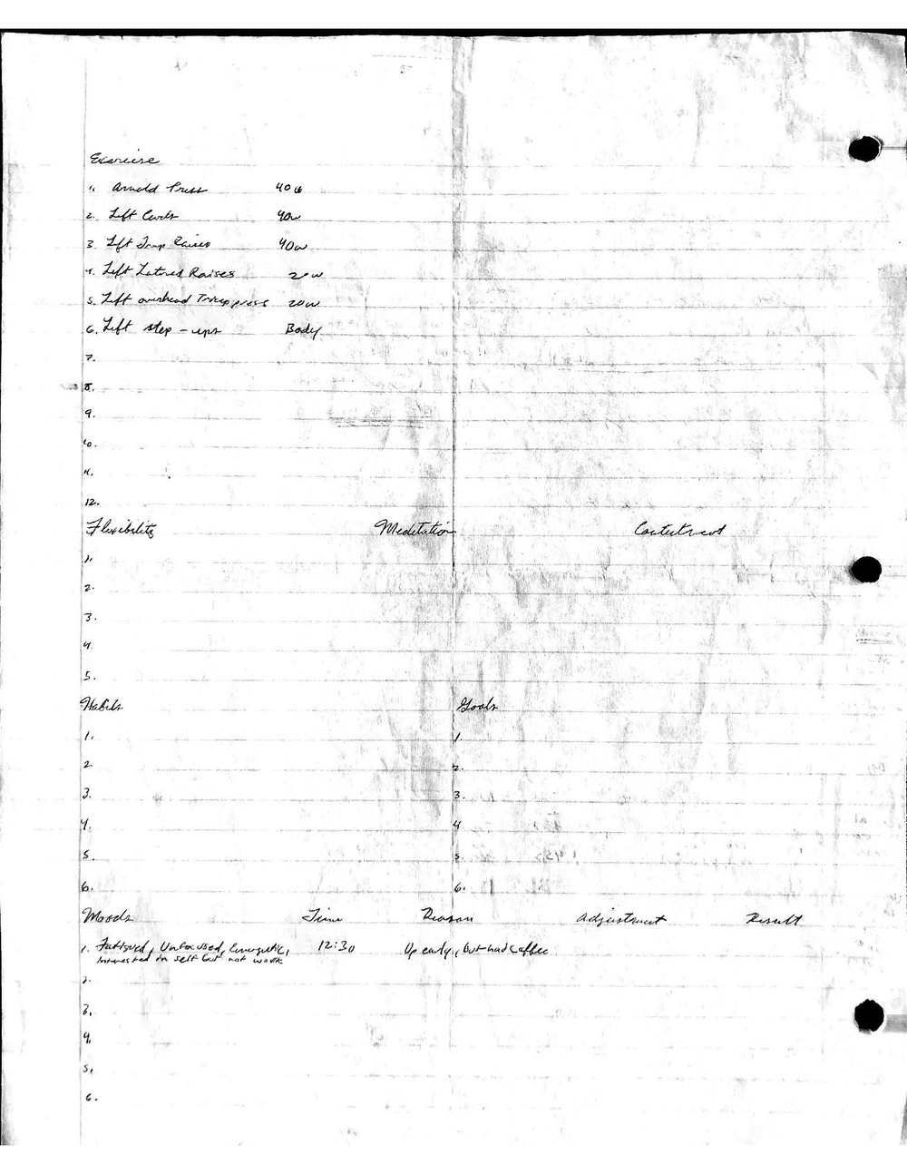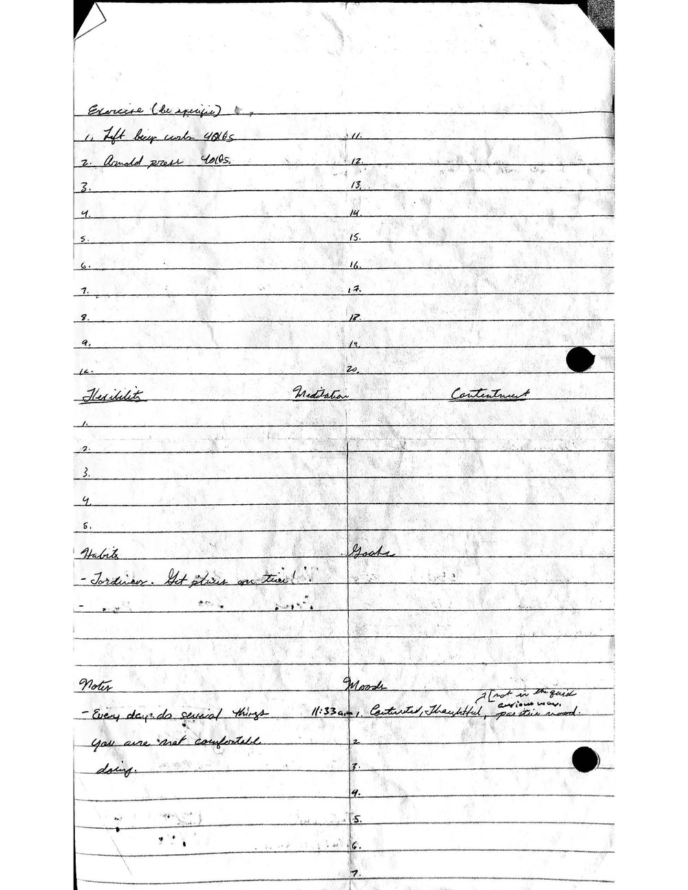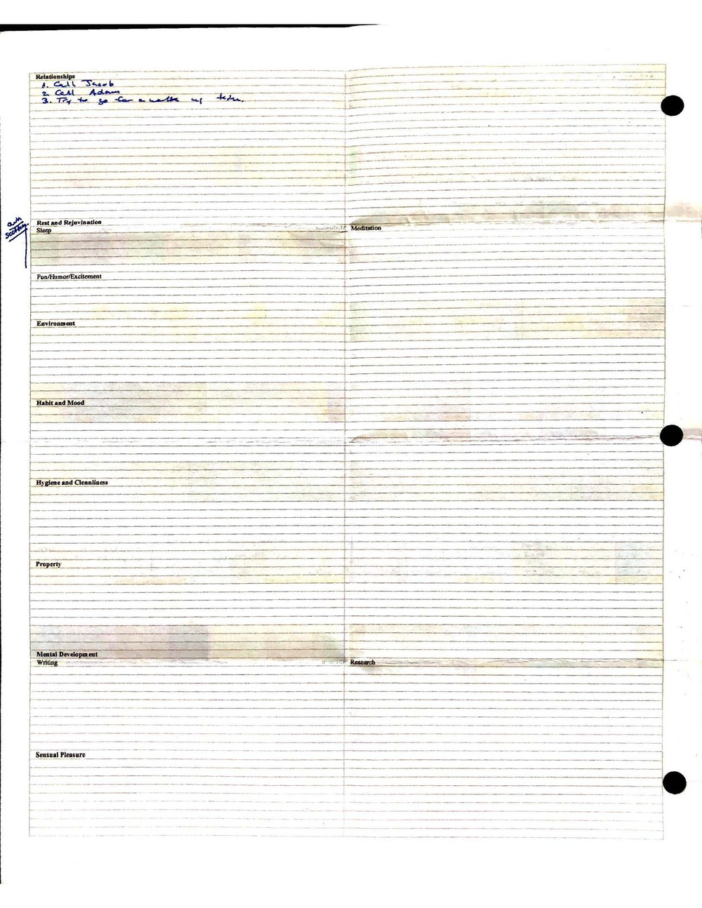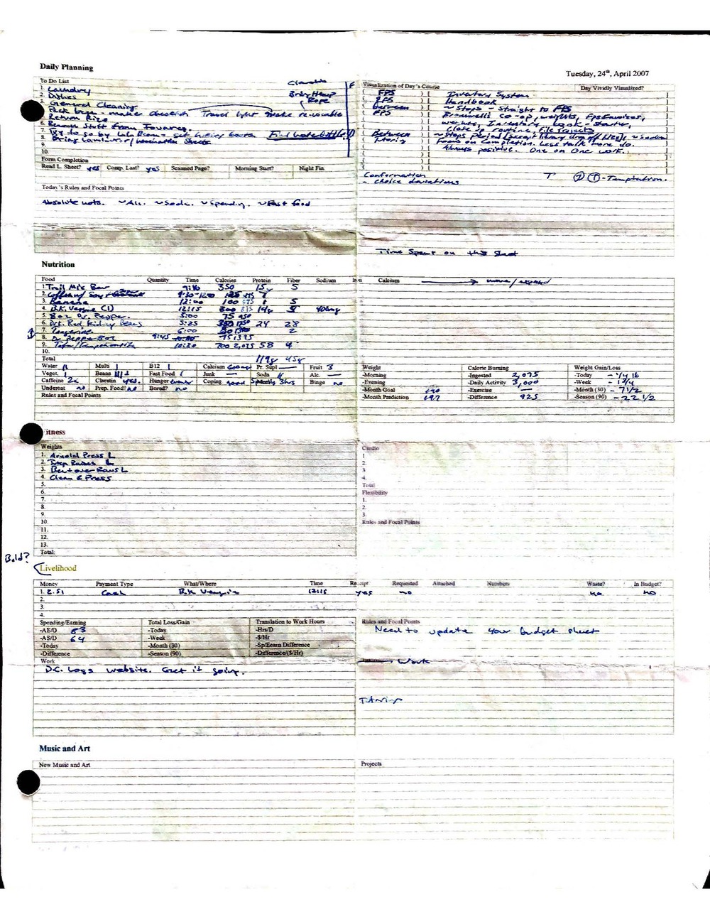 This is a highly personal and private document, shared for transparency, to give additional background on my work in moral philosophy. Its purpose is to enable personal self-help, but the overarching goal is moral in nature. I kept personal forms to track important activities in my life for a long period of time, and used the process to understand what it takes to make large amounts of personal changes independently. It is large, at ~410 MBs, and over 500 pages, so might take a bit to download and view. Not every form I filled was kept and included in this archive, and I suspect perhaps a hundred or so went missing. I kept very good records, but I do find pages on occasion that did not make it into the binder.