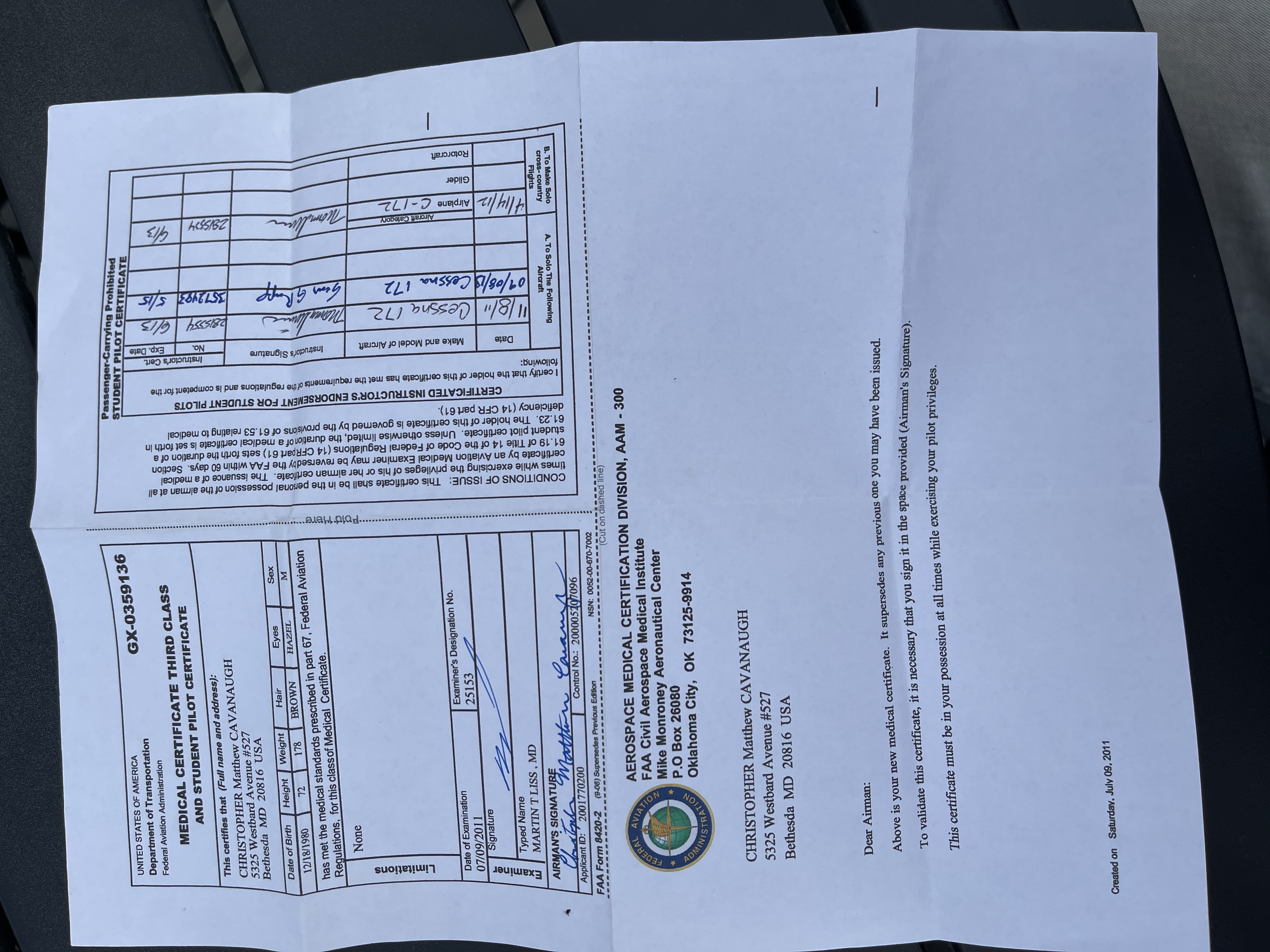 First third-class pilot’s medical certification from when I started flight training: