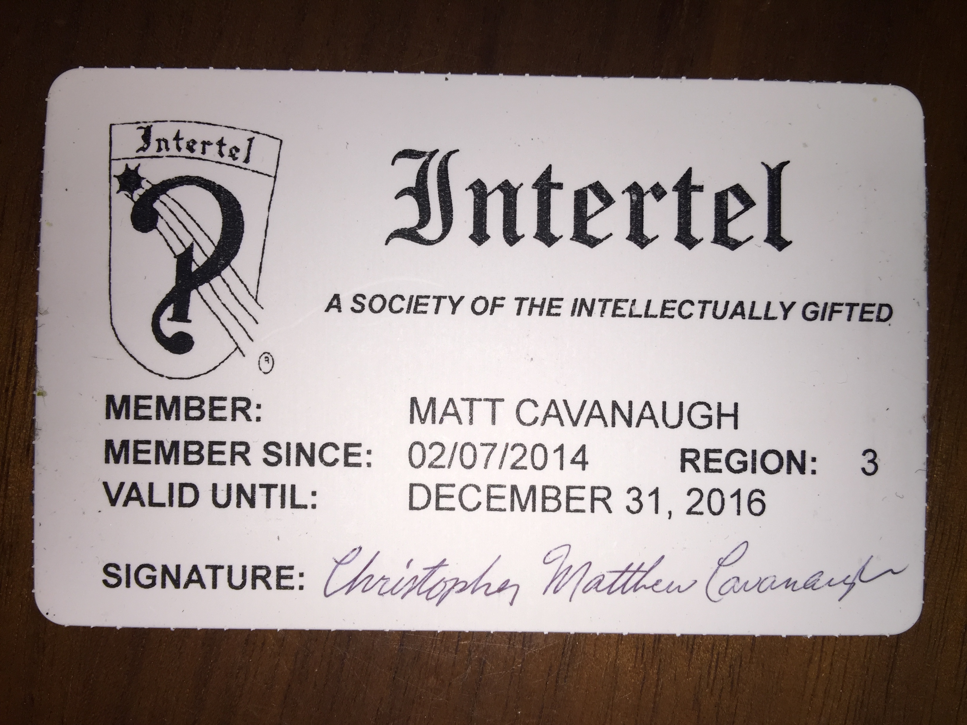 Below is my Intertel membership card. I’ve had a number of these cards, and this is the only one I currently have on record, although I’m a current member. Intertel is a High IQ society like Mensa. I have also been on the member directory page, which can be viewed on my profile within the archive version of the Intertel website. If you are a member, I can be found in the active member directory using my former name “Christopher Matthew Cavanaugh”. More recently they have made this profile data private, while earlier it was public.