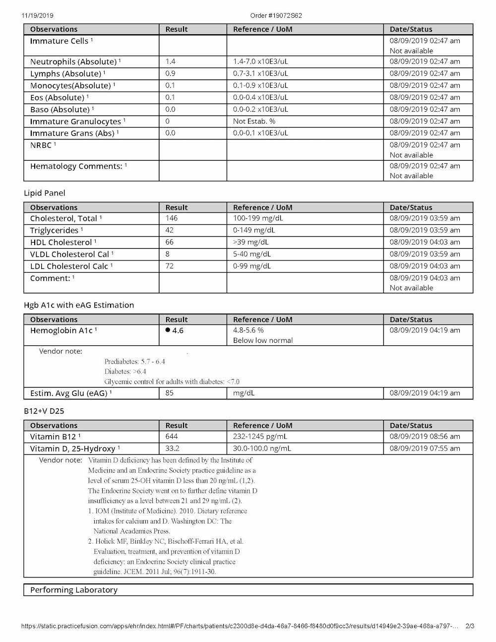 Recent blood test results, from August 8th, 2019.