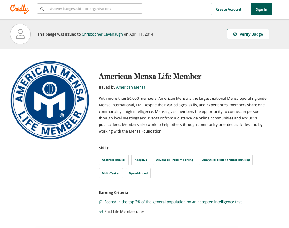 Below is my Mensa ID showing my lifetime membership in the High Intelligence community. I have more connections into the High Intelligence community than Mensa, but Mensa lifetime membership is adequate to authenticate gifted intelligence. You can also find me, if you are a member, in either the Mensa International or the American Mensa directories. I’m also a member of Mensa New Zealand on social media and can tagged and accessed there, using my current name “Mattanaw”. I can also be mailed at my mensa email, and see that it does not bounce back, although I may not respond: christopher.matthew.cavanaugh@member.mensa.org.