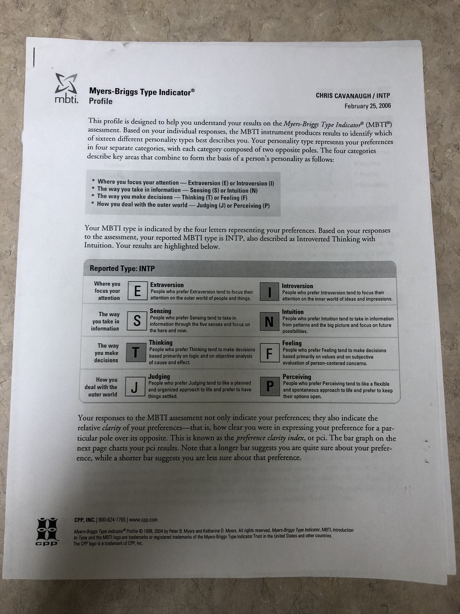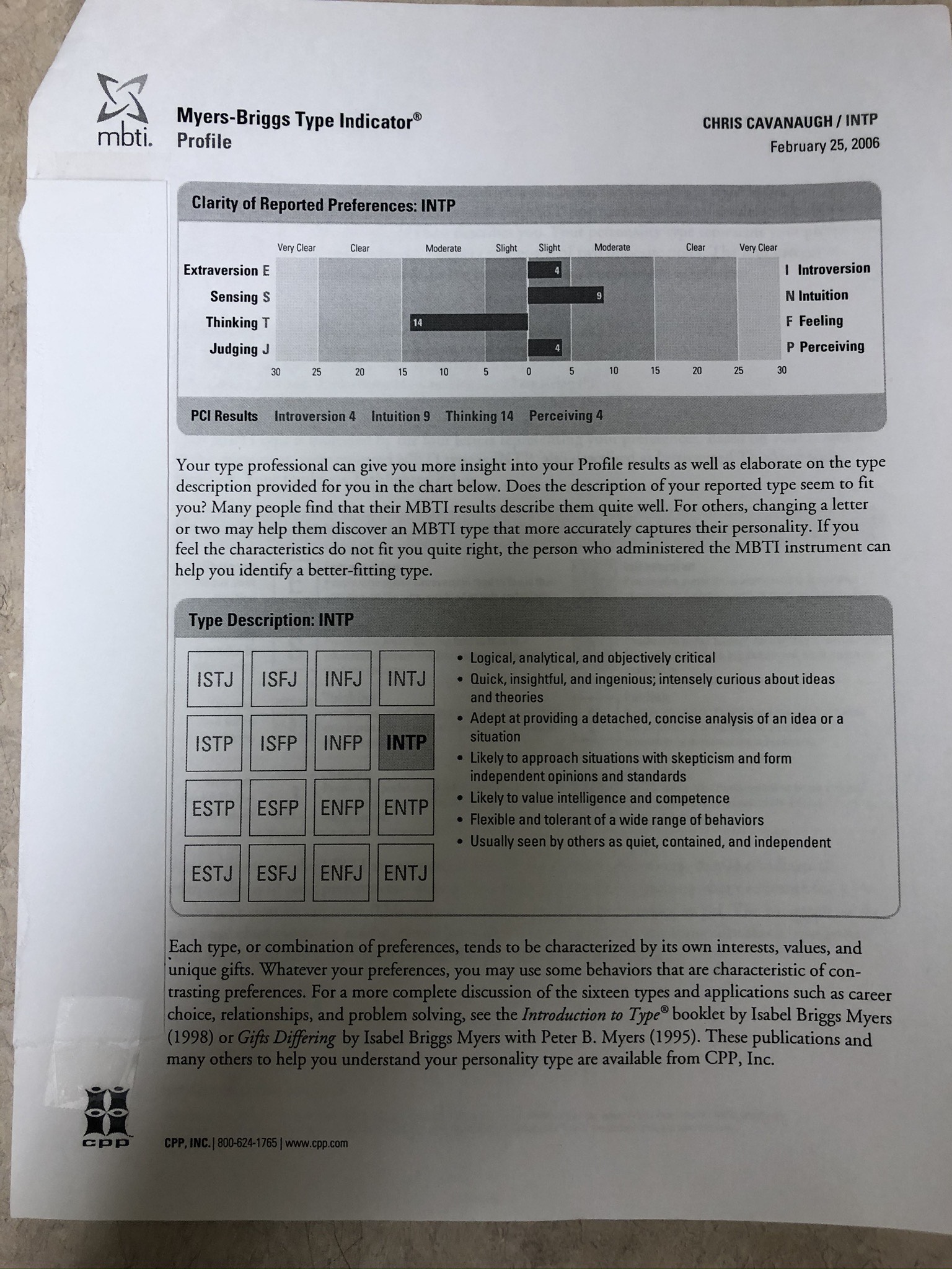 Below are my Myers-Briggs test results from 2006.