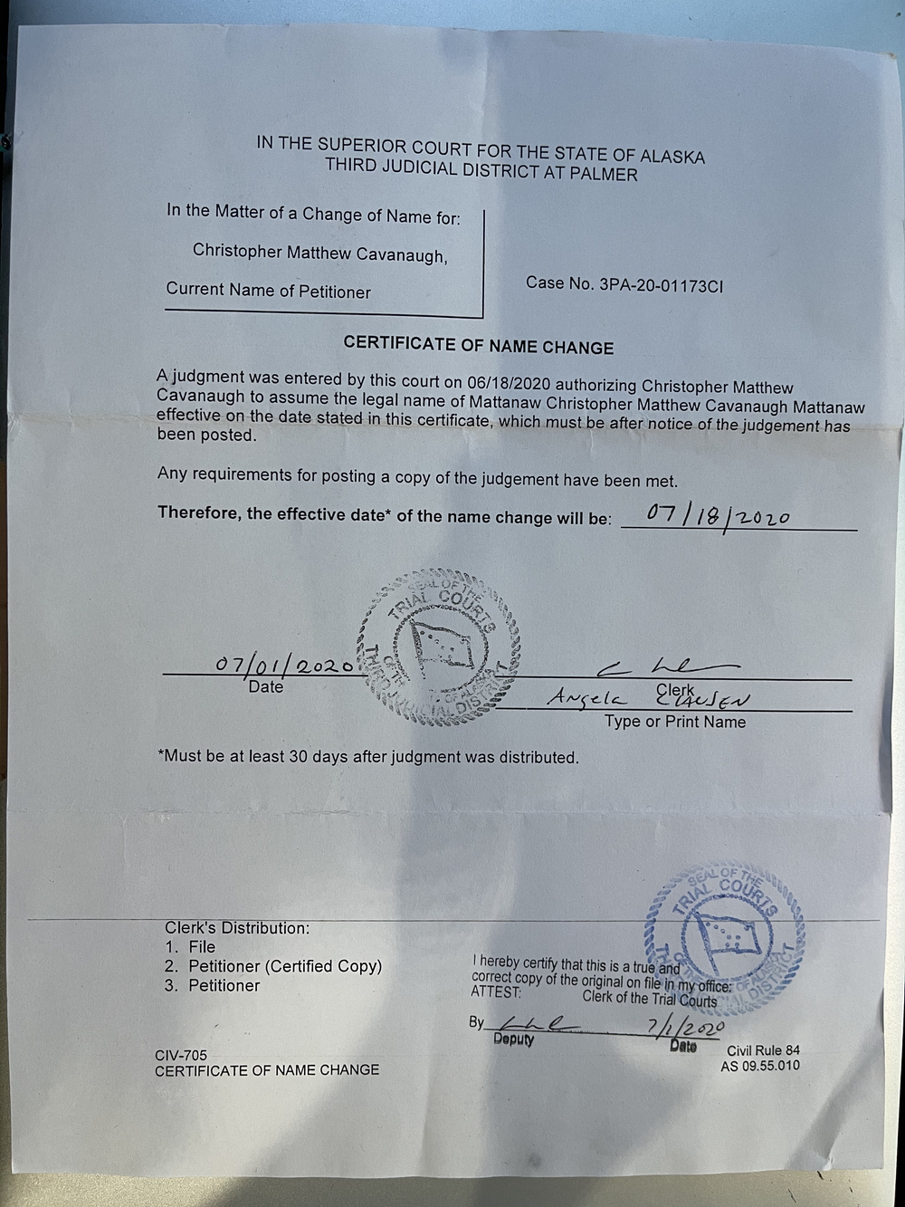 As you can see on the court order provided above, my name change was effective in June 2020. I filed for the name change prior to that. When you file for name change, they publish a change of name to a public record, and it has to remain public for some time (perhaps about 3 months) before the final name change is allowed. This is a method of making it public “by publication” which is used by the court in other areas of law as well. This is a step for the person filing the name change to also show seriousness about the change. Before this was done, however, my name had already been on record in numerous locations and was effectively already a prominent social media name I had apart from my birth name. After this there was a hearing in Anchorage that I attended telephonically in Palmer, Alaska, where my name change was approvved. The court document above is the document I received.