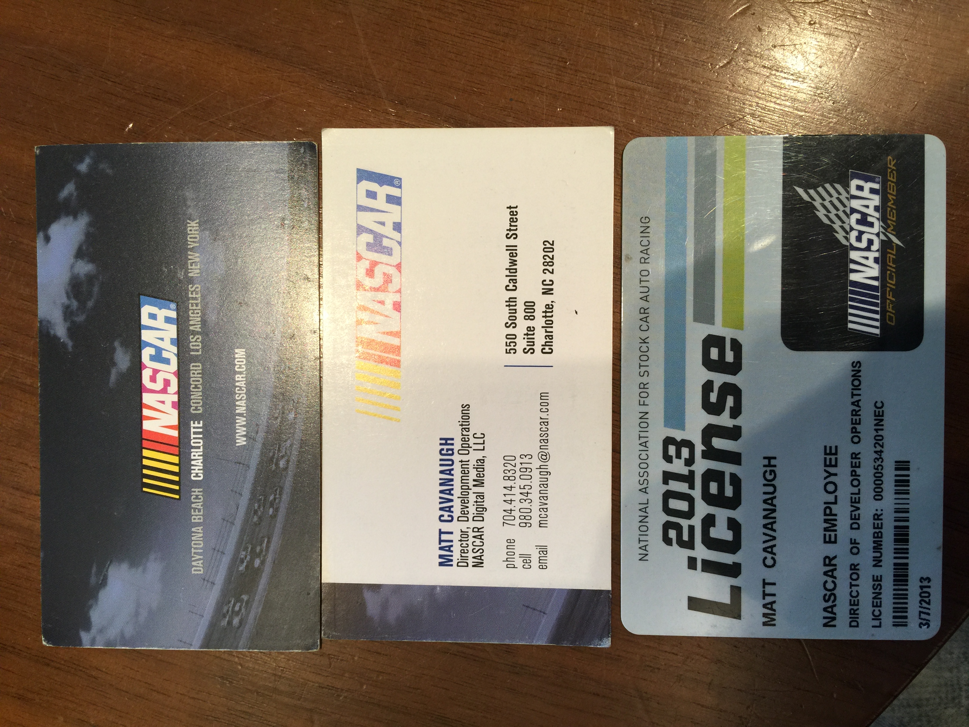 My NASCAR business card from when I was their Director, and my NASCAR Driver’s License: