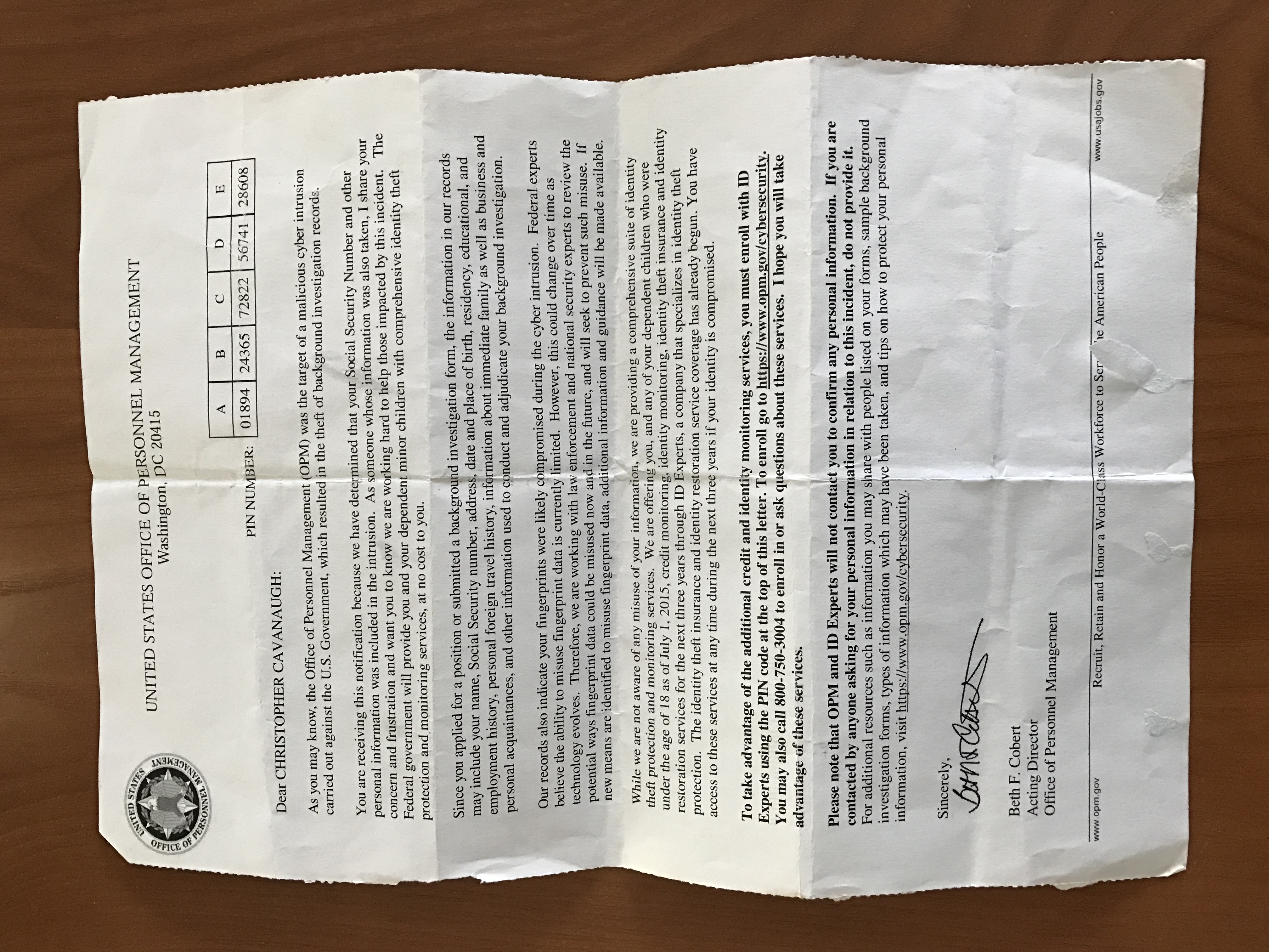This is the notice I recieved concerning the government data breach in which I was impacted. Notice it says my fingerprints and background were stolen. The same notice was sent to my now ex-wife claiming some of her details were also stolen. This was from when I was working for the President and First Lady of the United States, and other government representatives, at ASPA, in the United States Department of Health and Human Services.