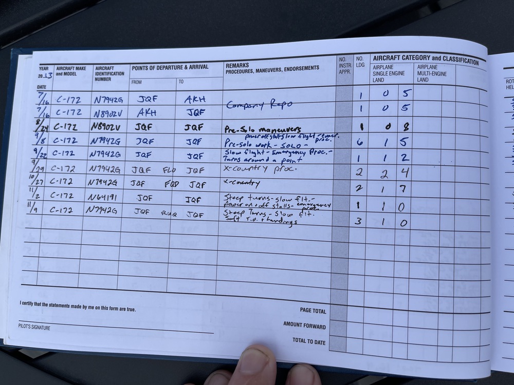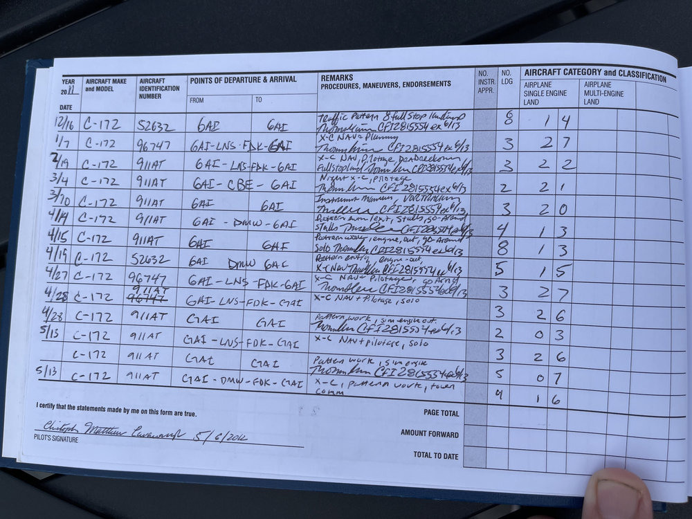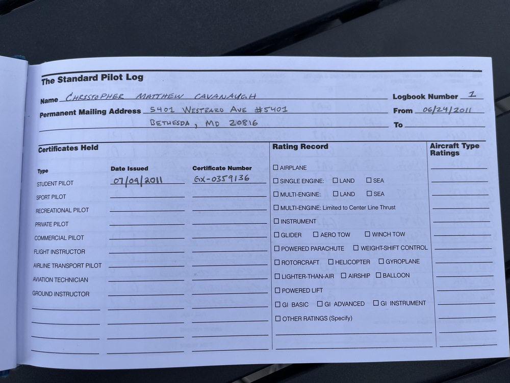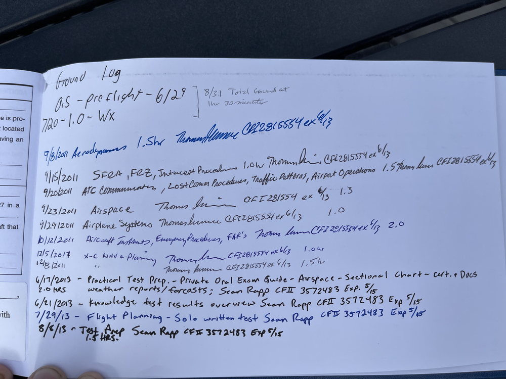 The is my Pilot’s log book that I had in my safe deposit box for a few years, while waiting to resume my final lessons to complete my PPL (Private Pilot’s License). I completed all steps except for my final check ride and have flown solo comfortably between multiple towered airports, as is required at the end of training.