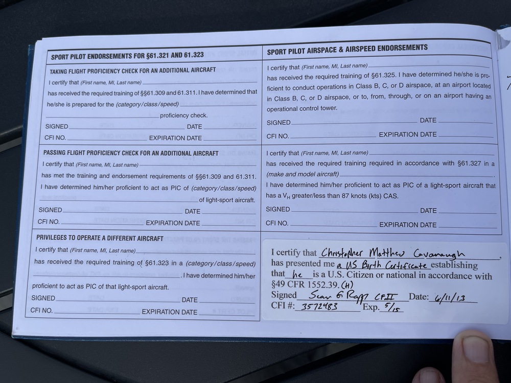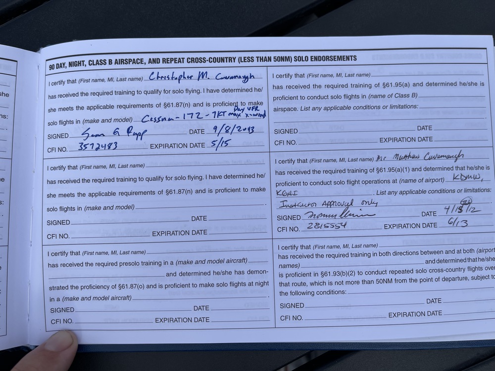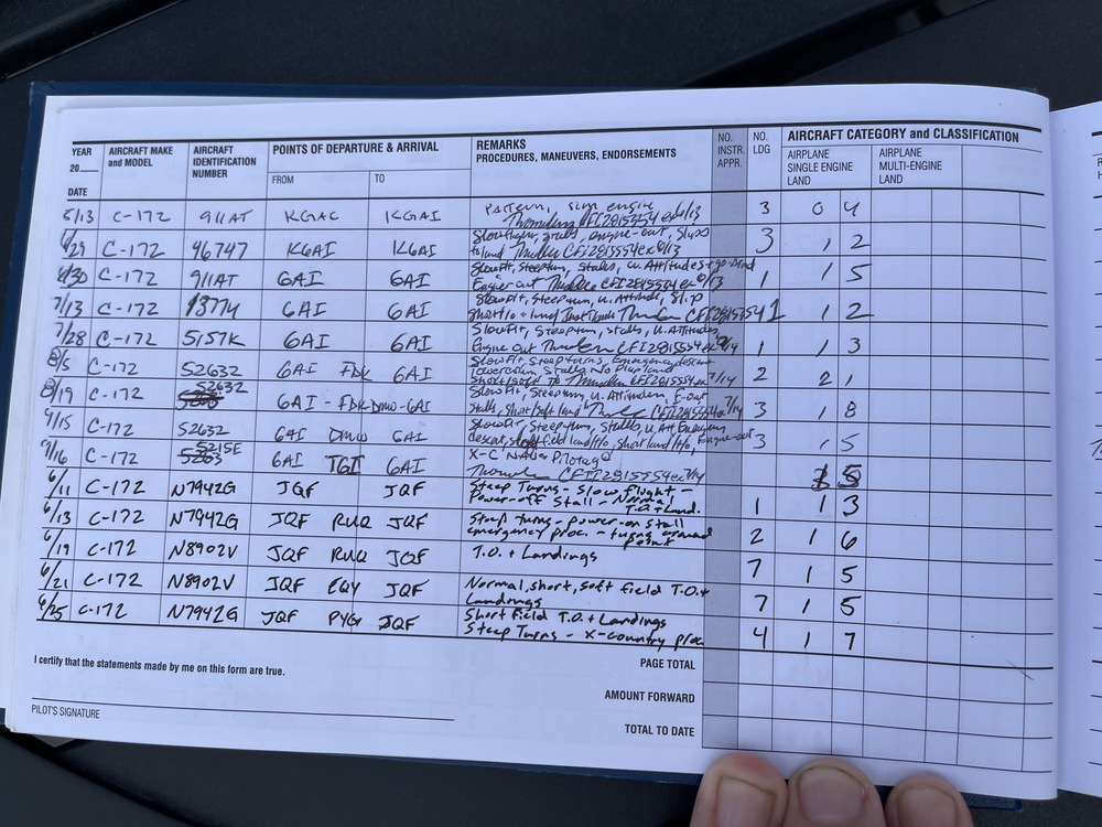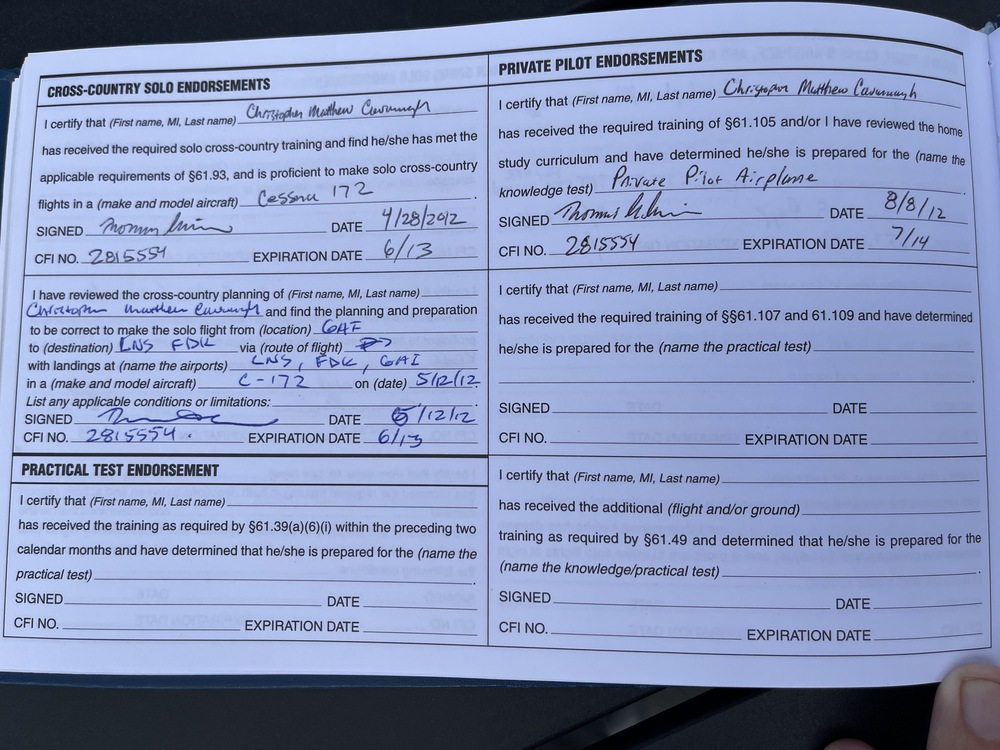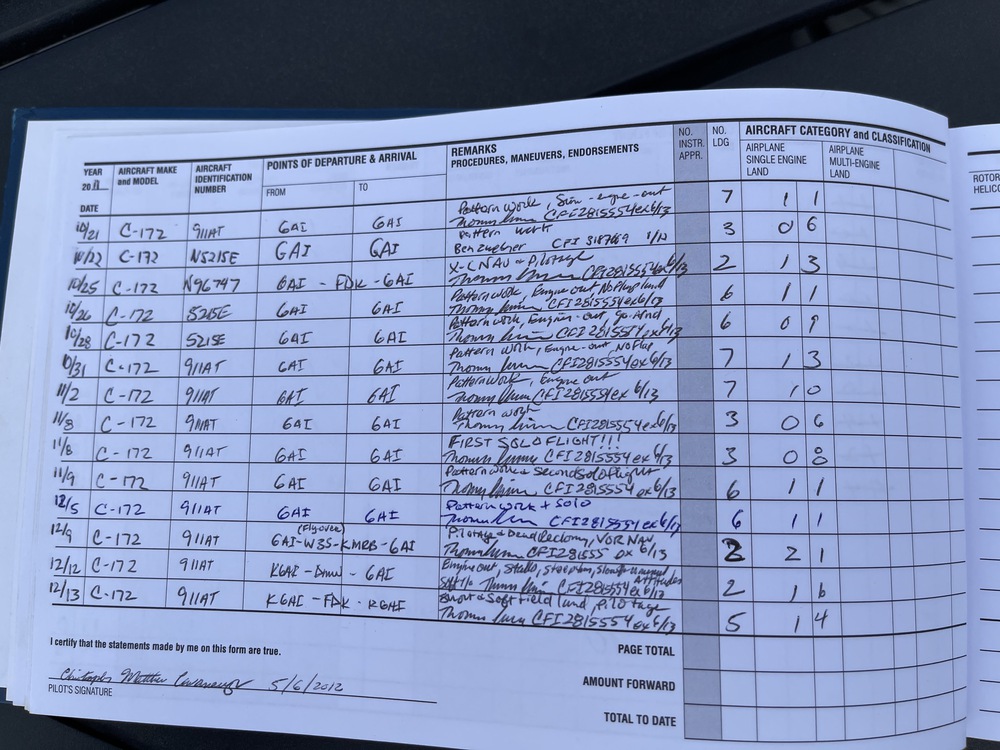 The is my Pilot’s log book that I had in my safe deposit box for a few years, while waiting to resume my final lessons to complete my PPL (Private Pilot’s License). I completed all steps except for my final check ride and have flown solo comfortably between multiple towered airports, as is required at the end of training.
