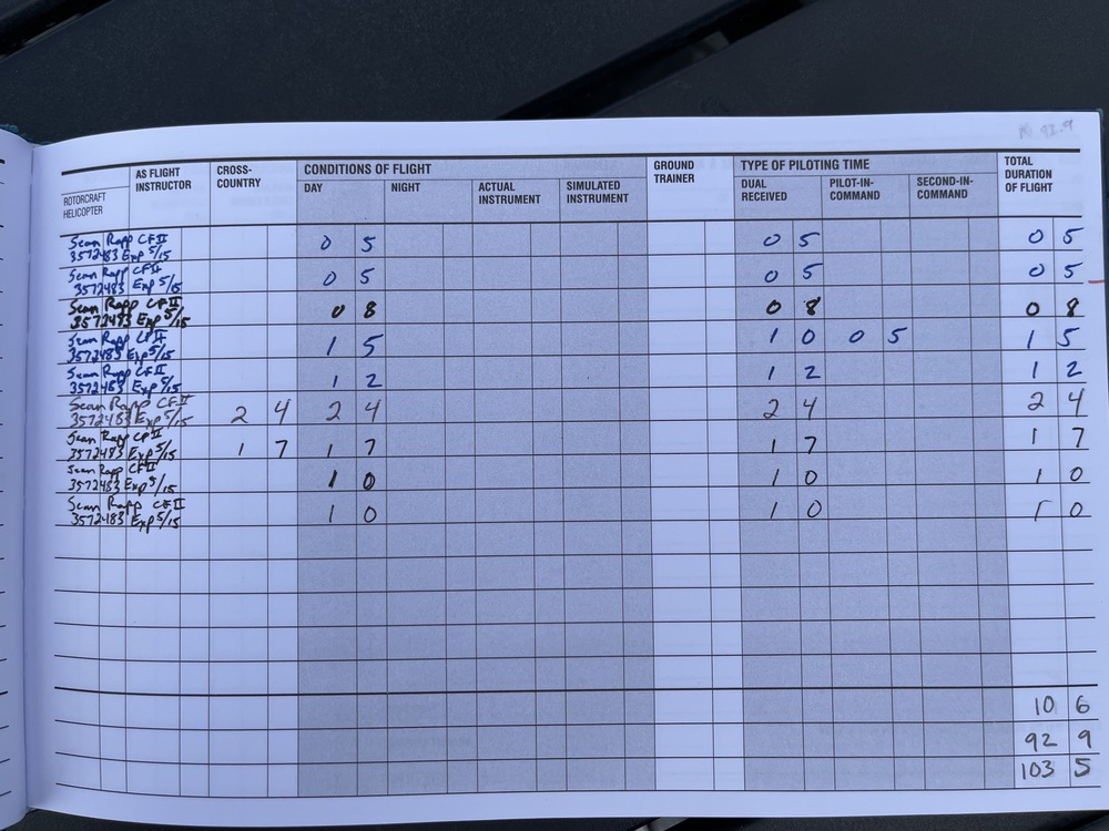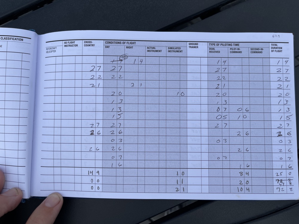 This logbook shows my solo endorsements and all training including written. It indicates that my current total number of flight hours is 103.5, which is far above the required 40 for PPL, but far below what is necessary to transport someone via jet.