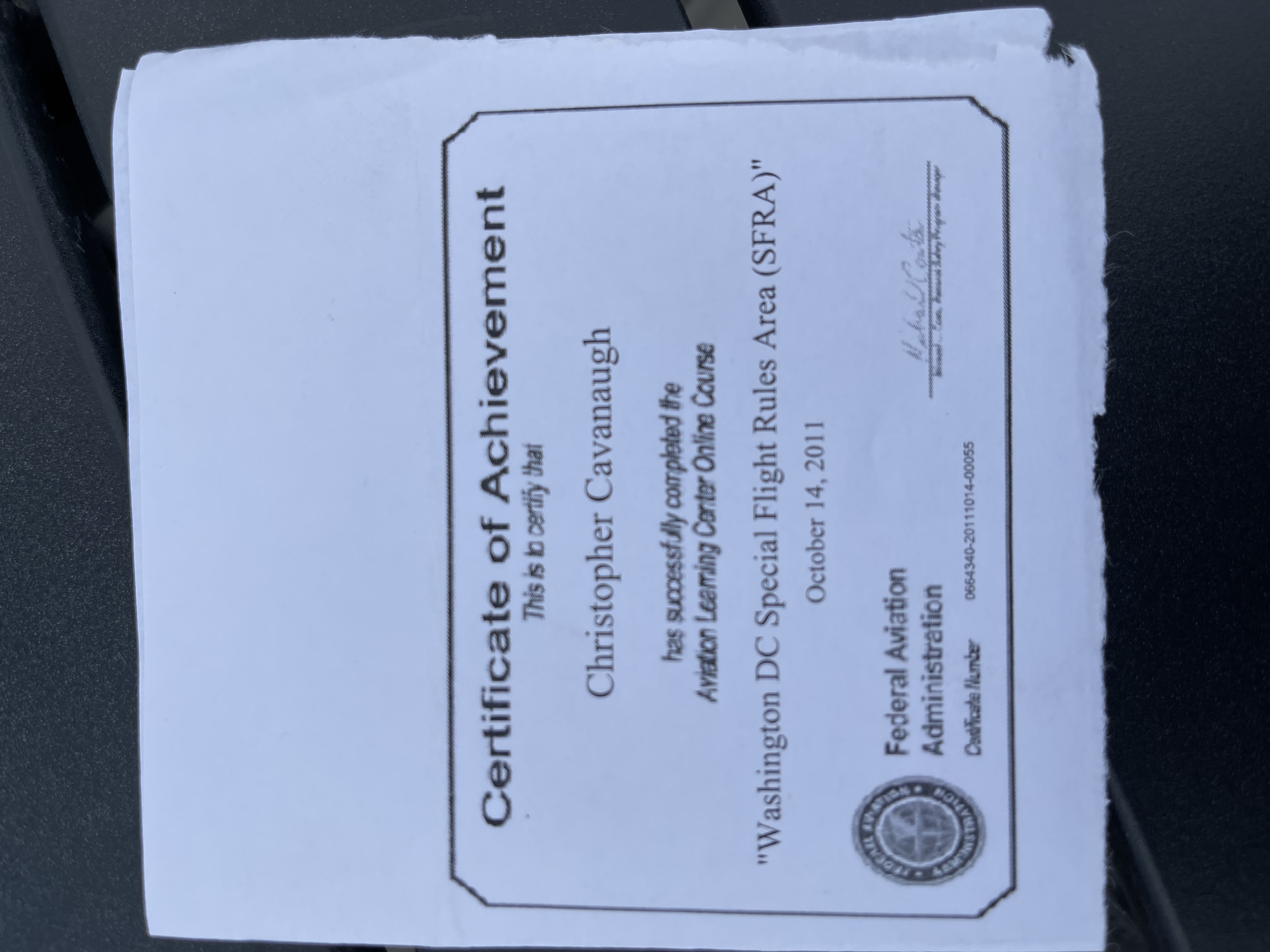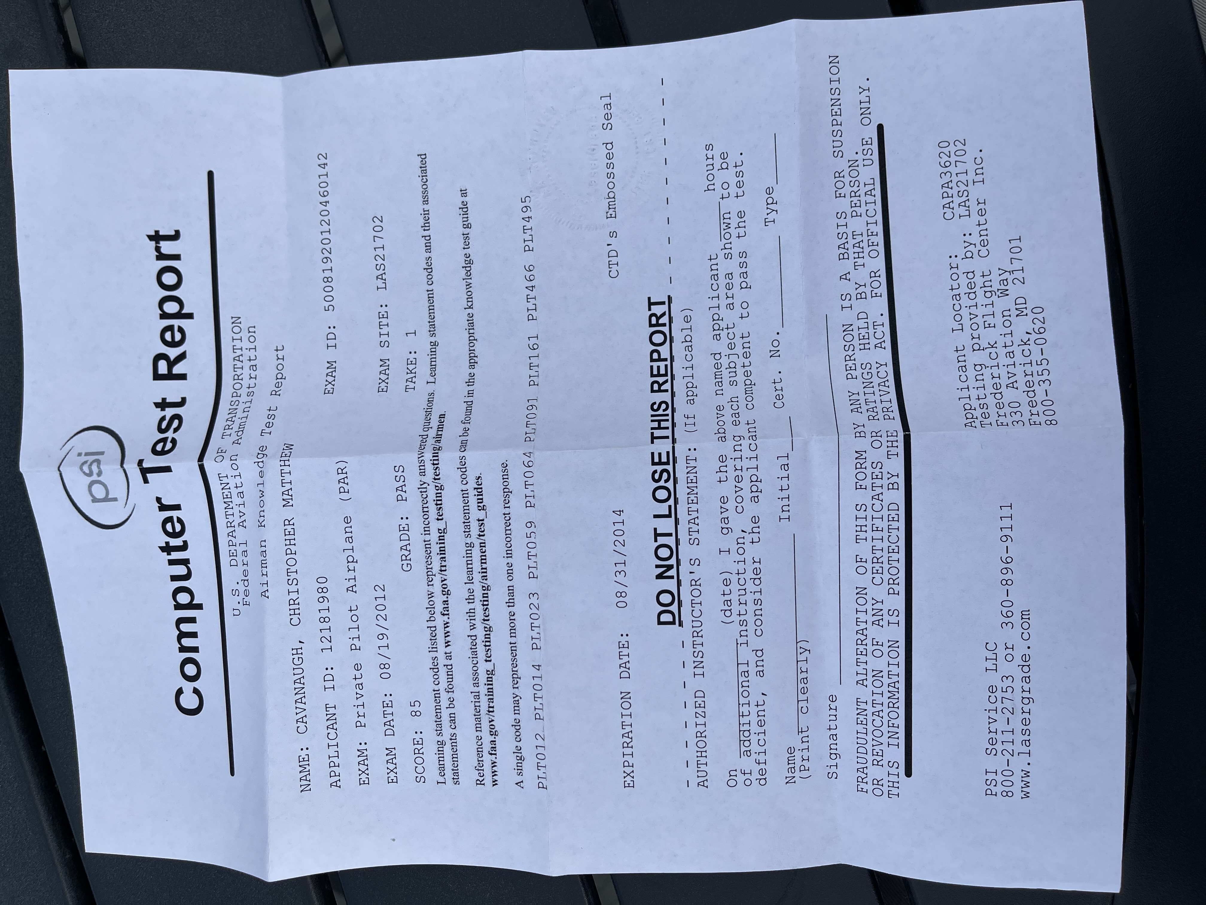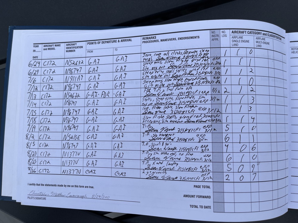 In addition to my flight log, I also have information regarding my written private pilot exam test result, and Washington D.C. special flight rules certification.