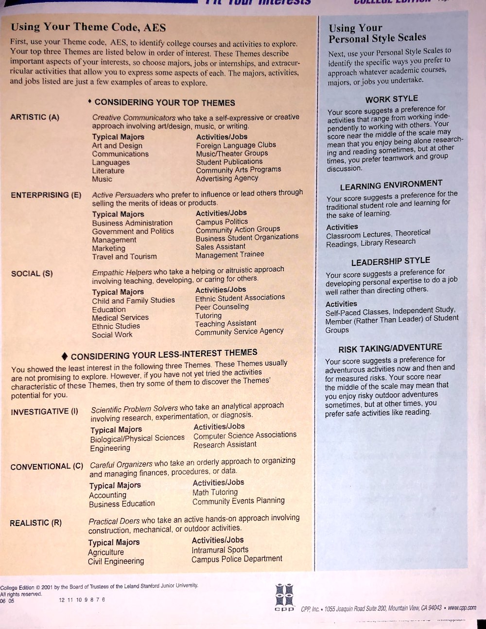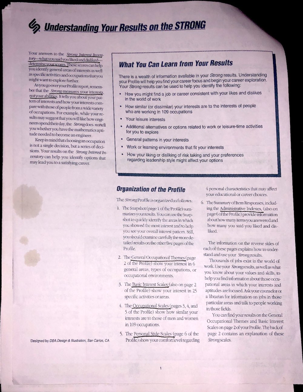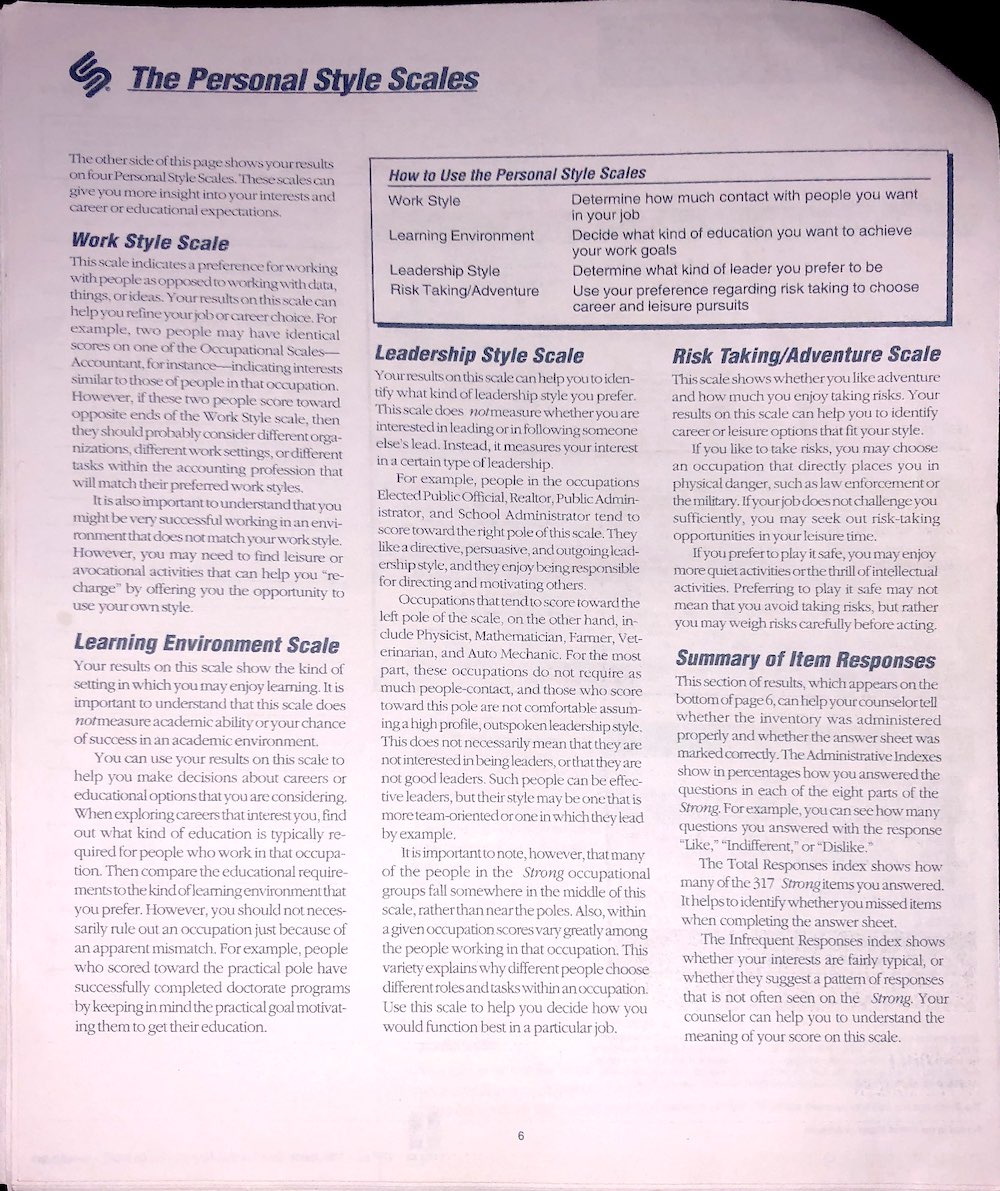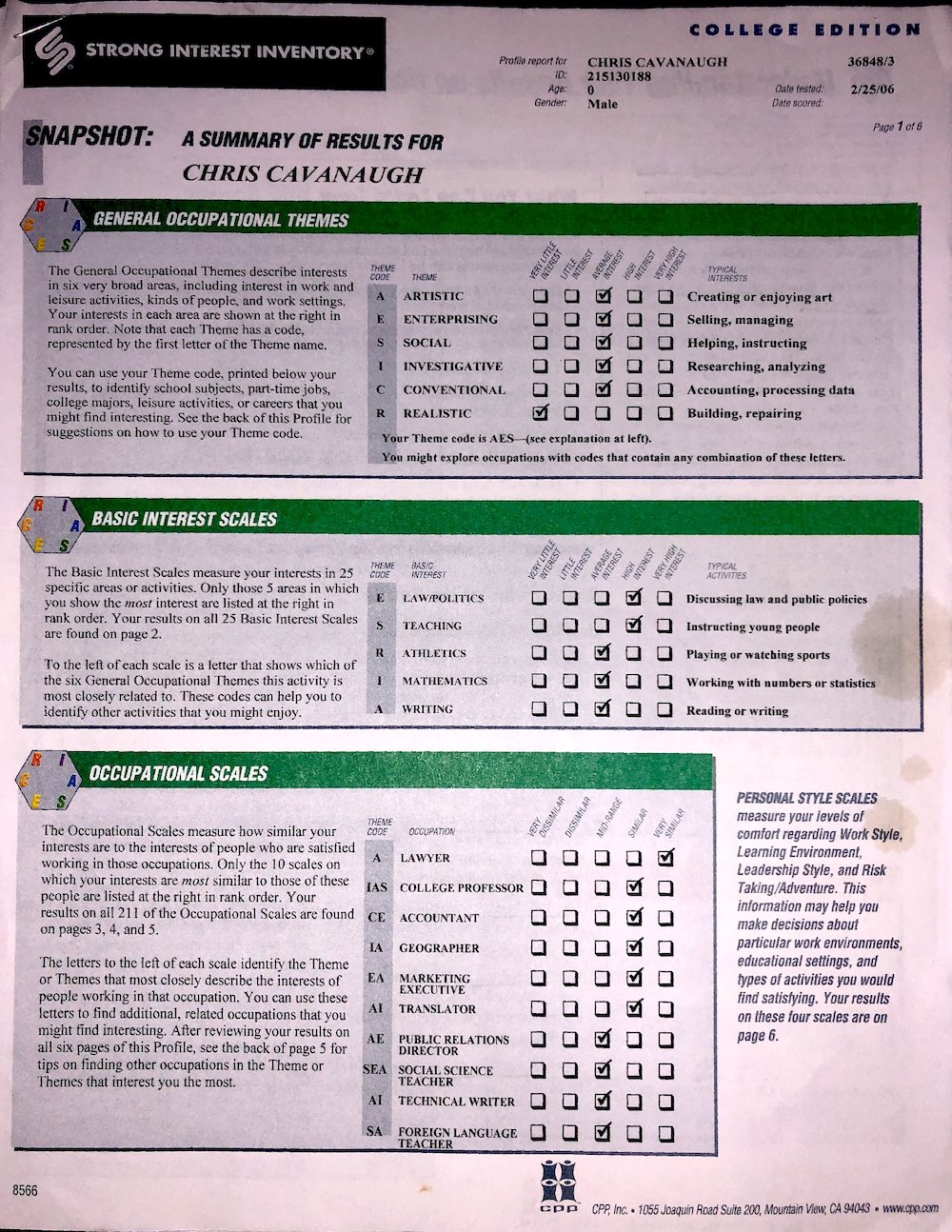 Strong Interest Inventory Results, from February 25th, 2006.