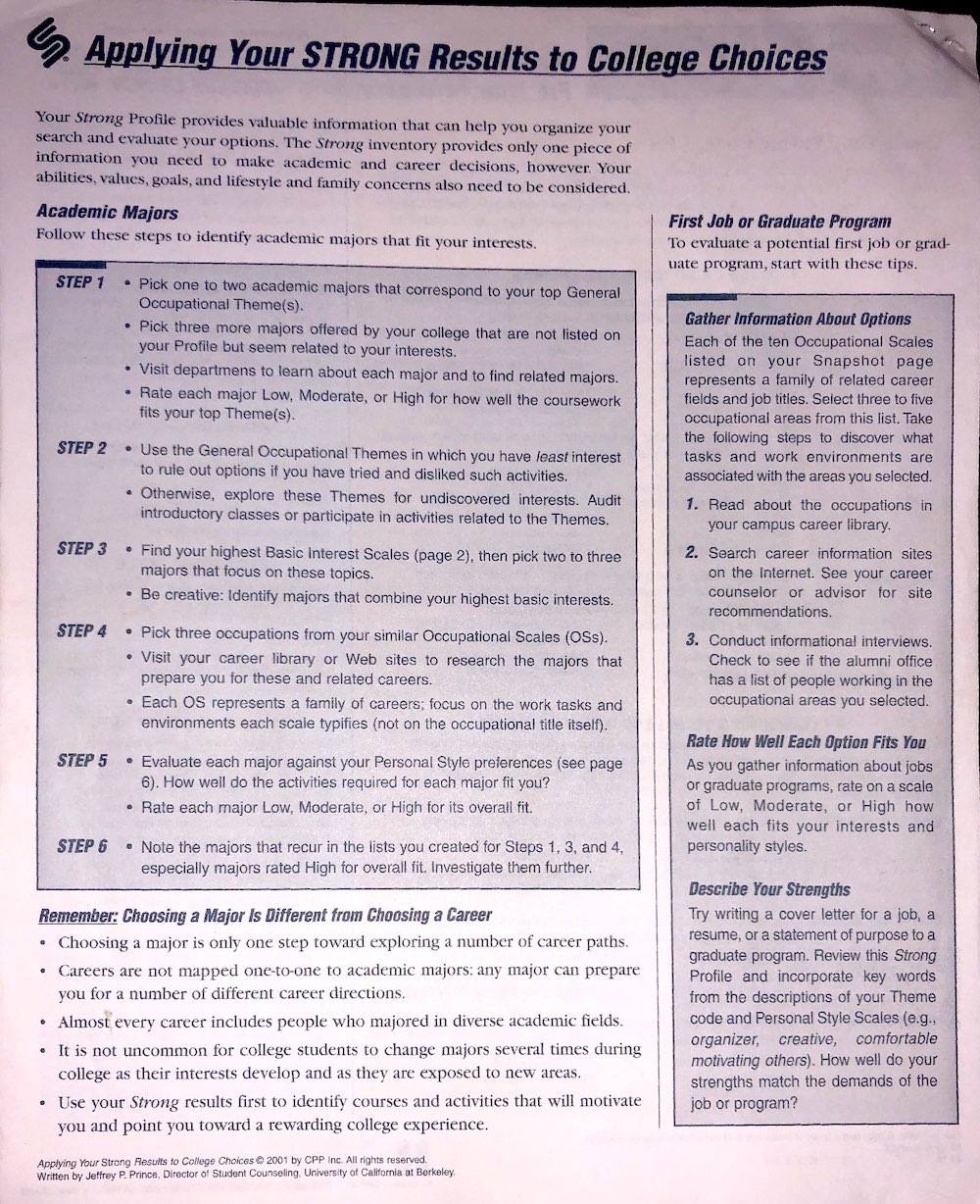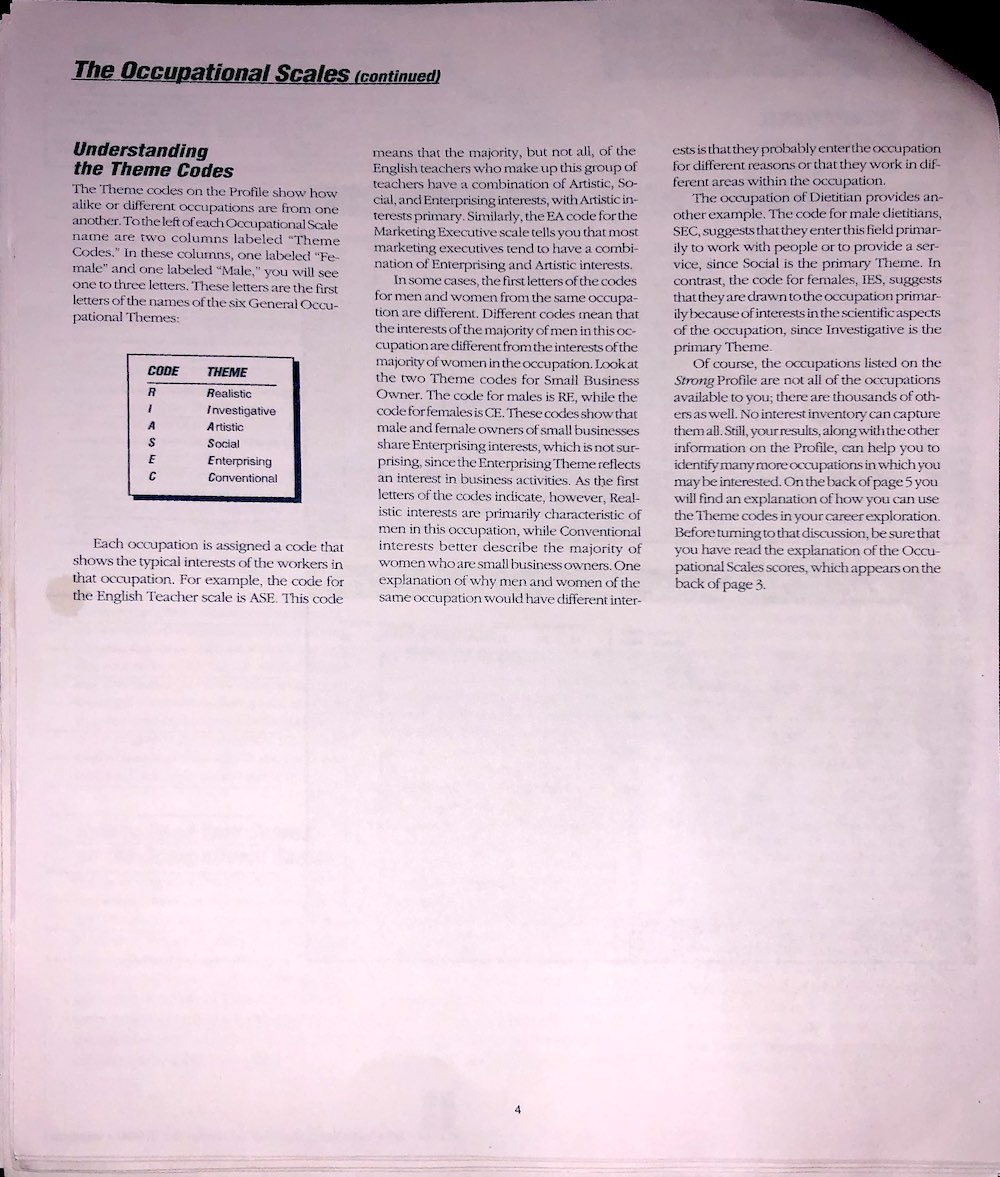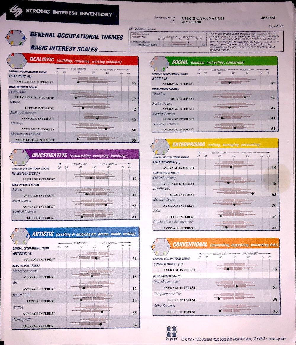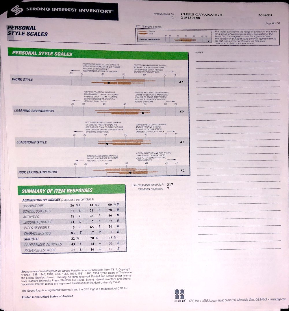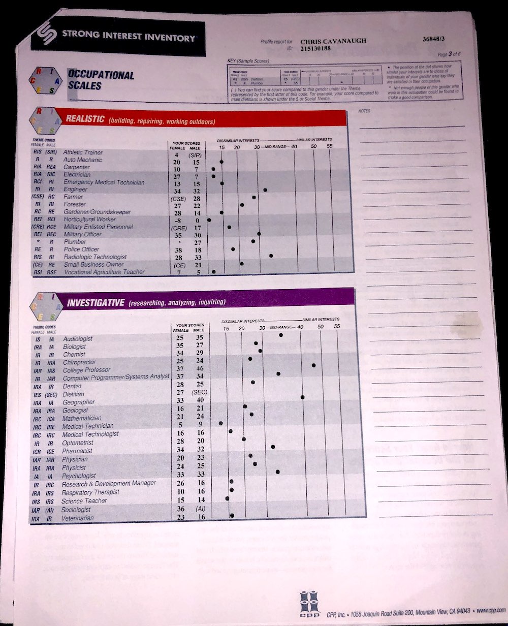 Not only will I be posting results for physiological examinations, I will be posting psychological tests as well, like this copy of the Strong Interest Inventory, and the Myers Briggs, and others I might take in the nearish future.